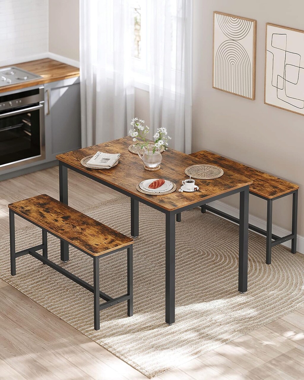 Set masa dining si 2 banci Vasagle, 110x70 x75 cm / 97x30x50 cm, PAL/otel, maro rustic