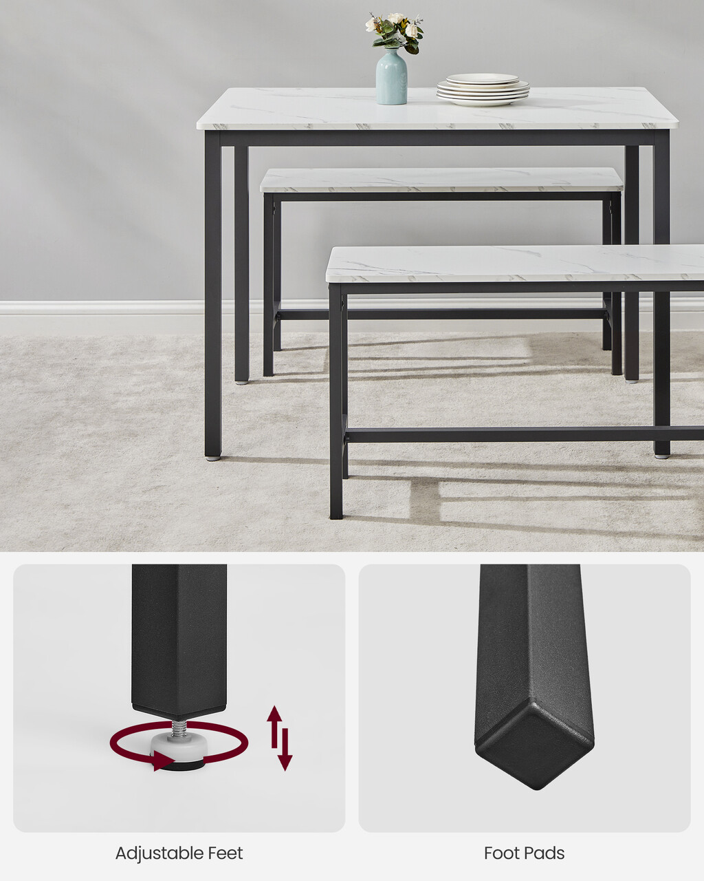 Set masa dining si 2 banci Vasagle, 110x70x75 cm/97x30x50 cm, PAL/otel, alb marmorat/negru