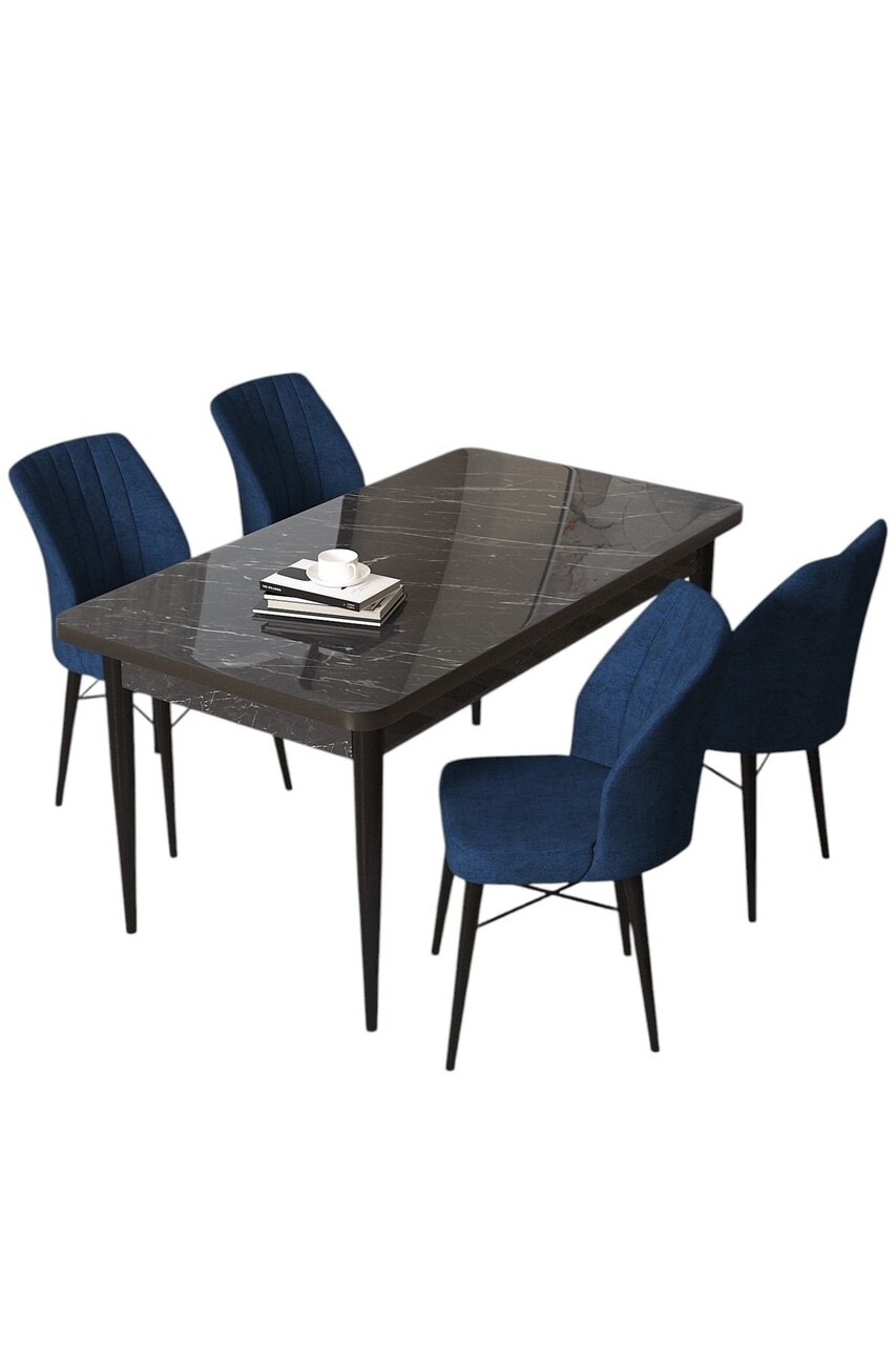 Set masă și scaune (5 bucăți), Hanah Home, Arp, Marmură neagră / Albastru marin