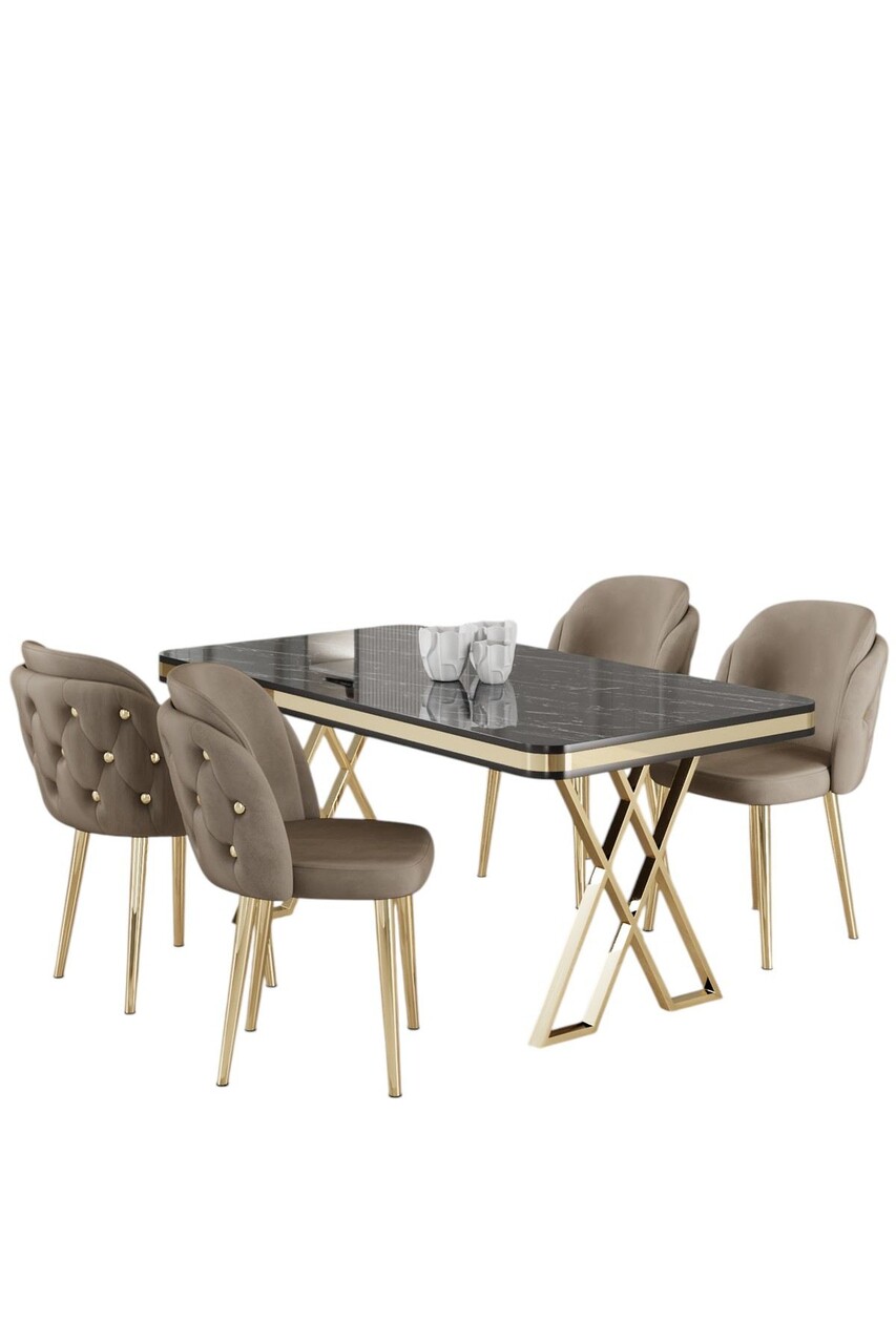 Set masă și scaune (5 bucăți), Hanah Home, Rigel, Marmură neagră / Auriu / Cappuccino