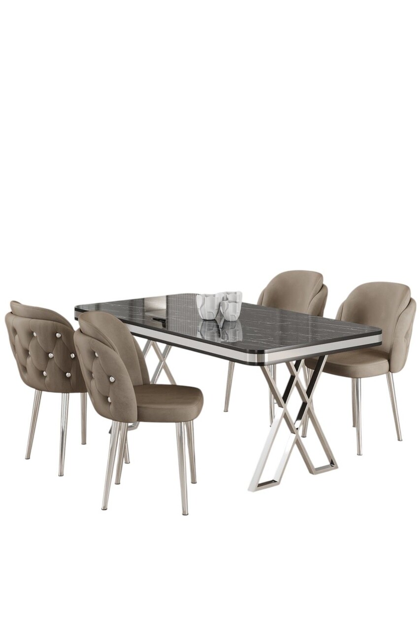 Set masă și scaune (5 bucăți), Hanah Home, Rigel, Marmură neagră / Crom / Cappuccino