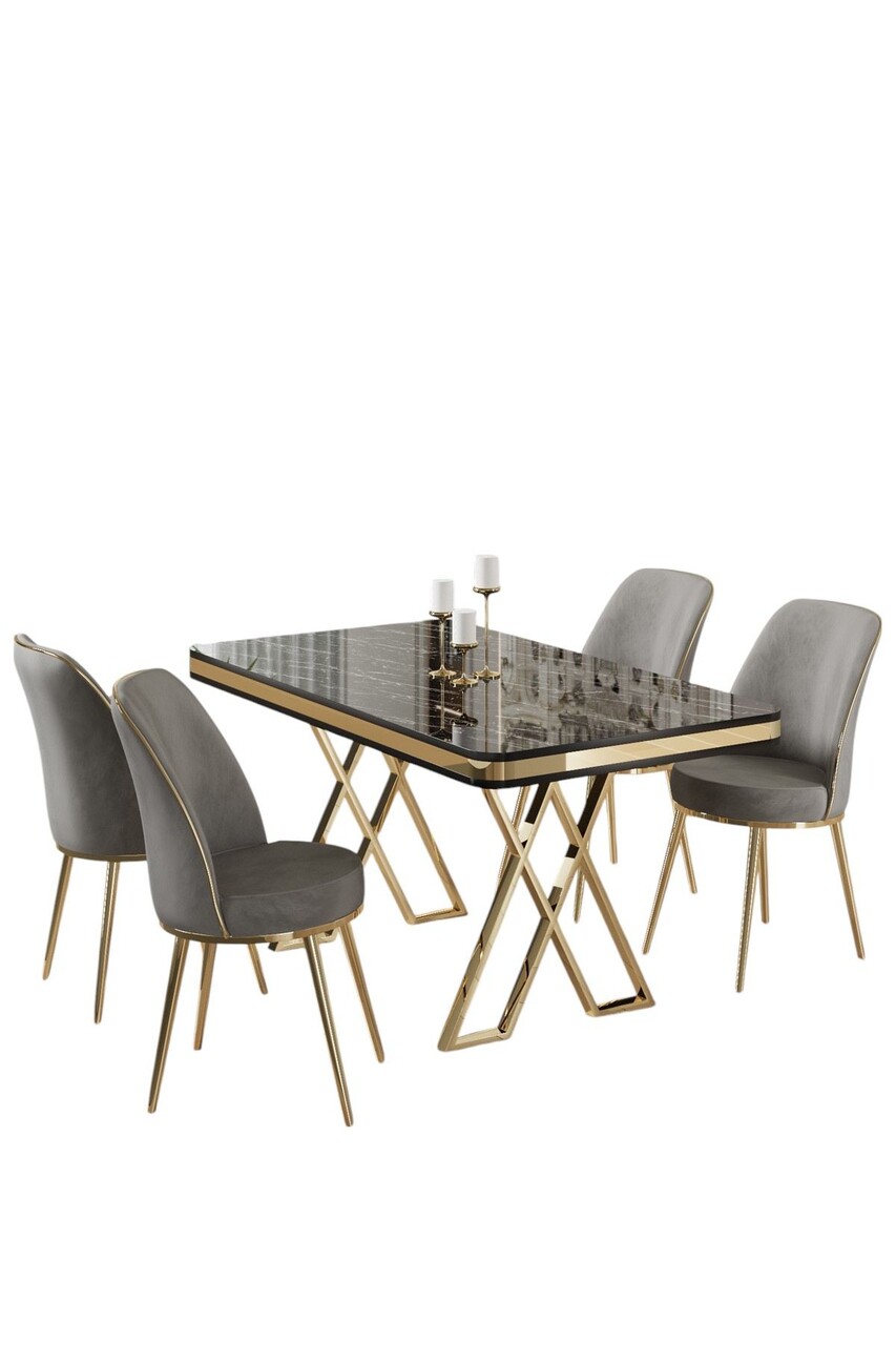 Set masă și scaune (5 bucăți), Hanah Home, Vals, Marmură neagră / Auriu / Gri