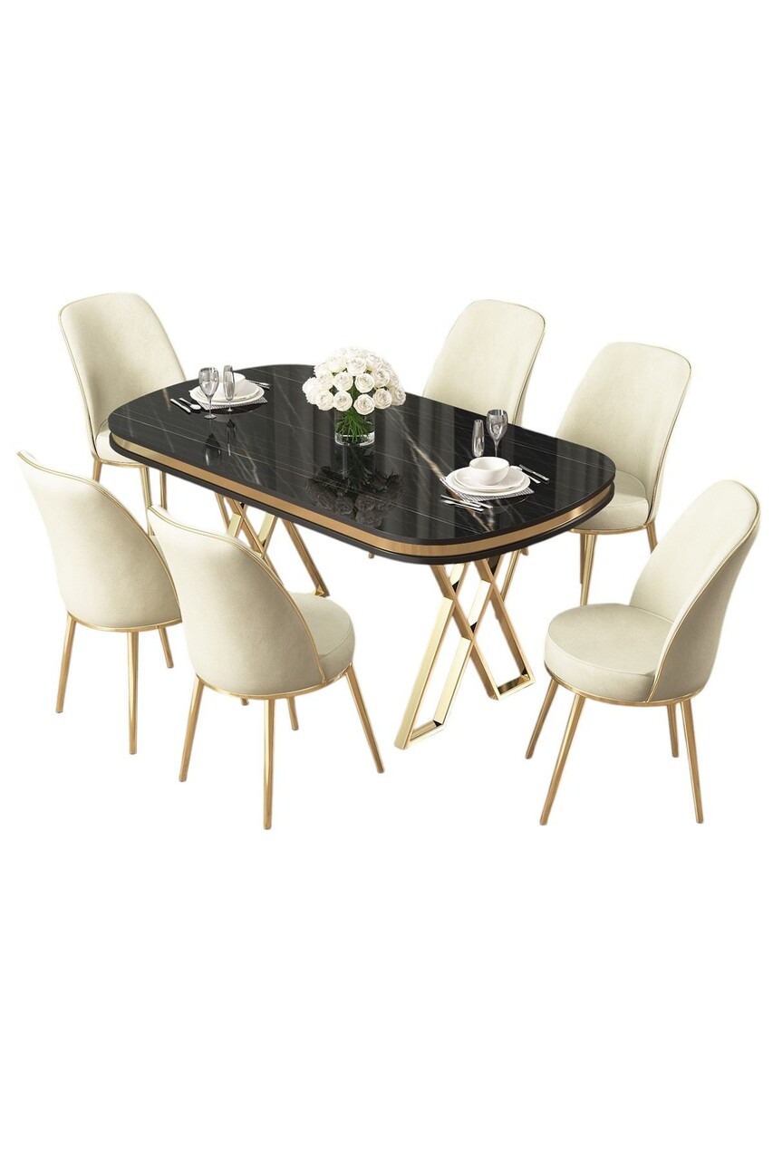 Set masă și scaune (7 piese), Hanah Home, Lai, Marmură neagră / Auriu / Crem
