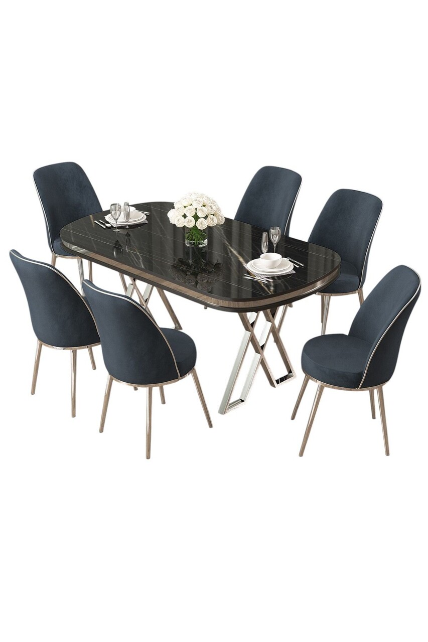 Set masă și scaune (7 piese), Hanah Home, Lai, Marmură neagră / Crom / Antracit