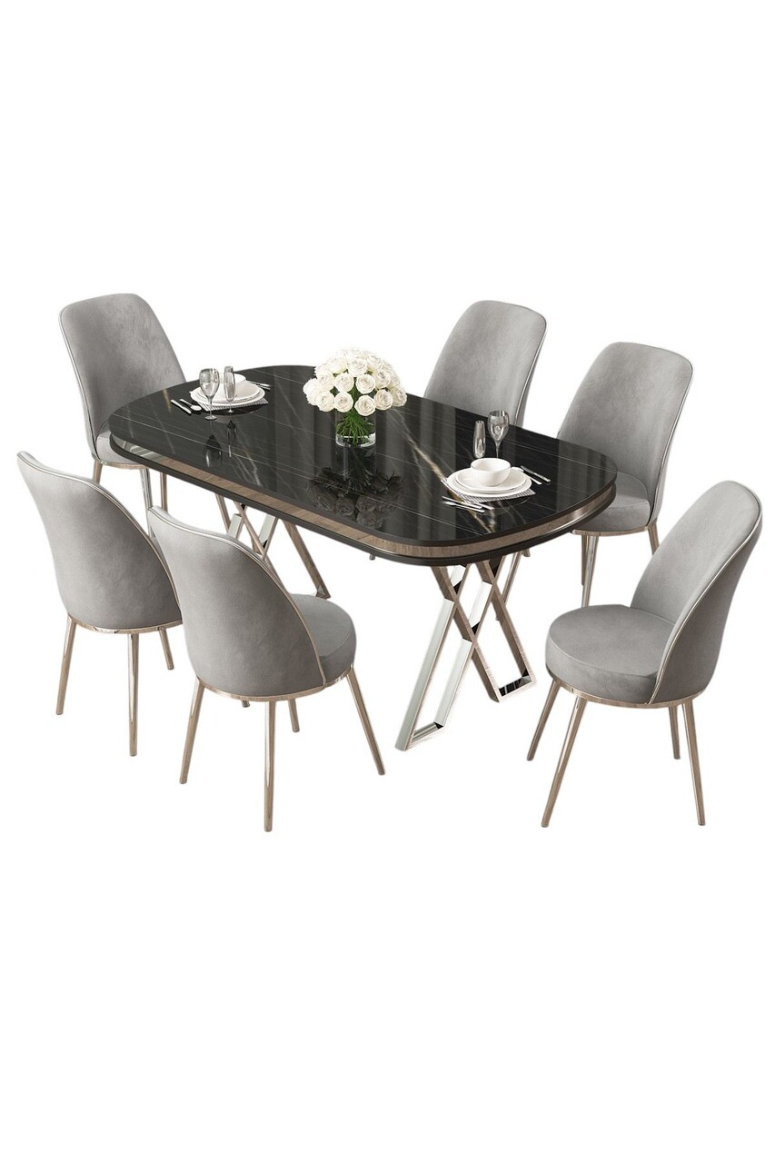 Set masă și scaune (7 piese), Hanah Home, Lai, Marmură neagră / Crom / Gri