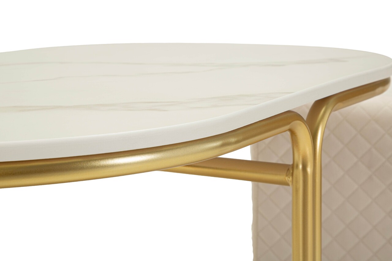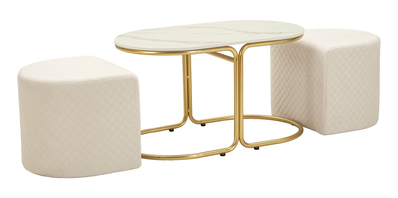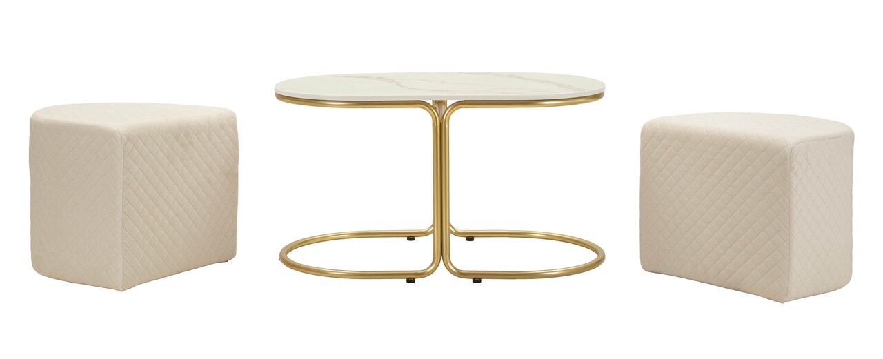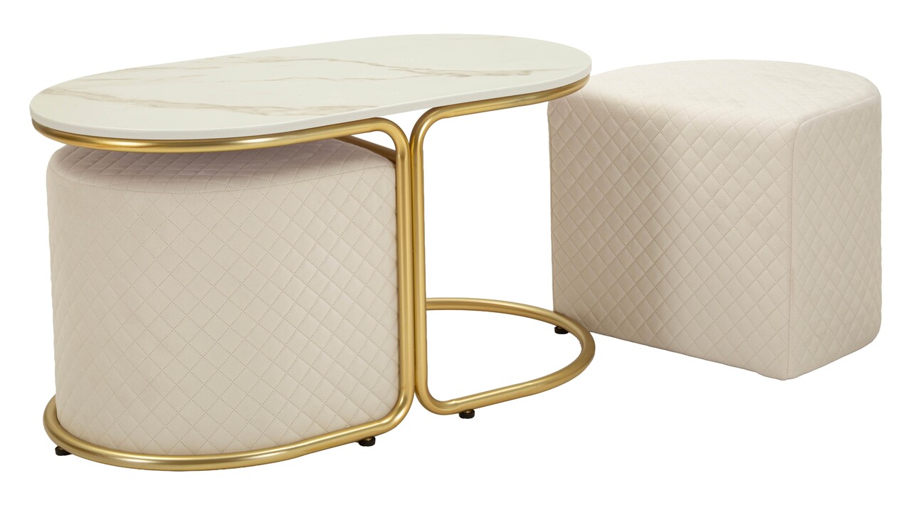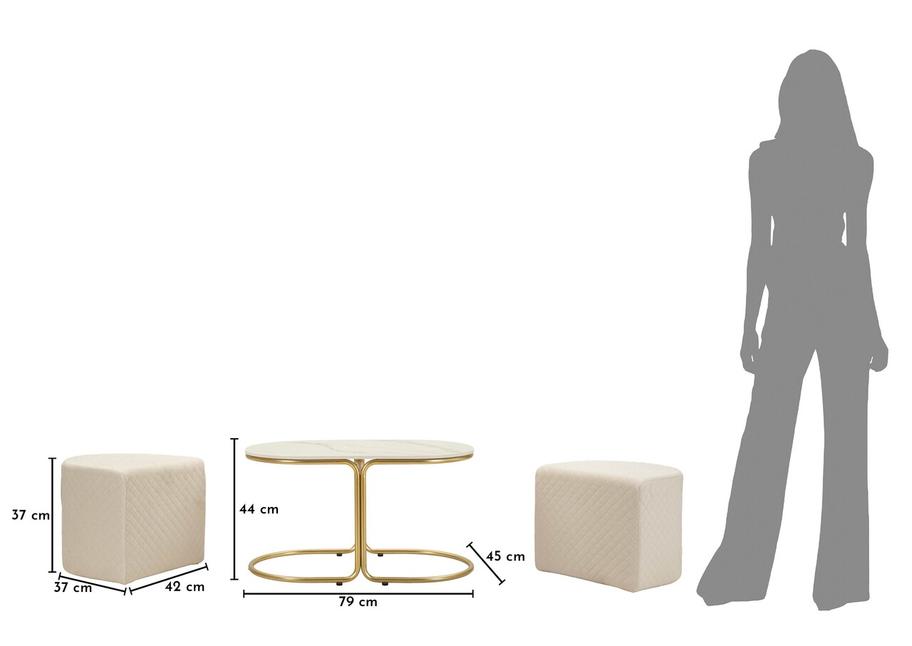 Set masuta de cafea si 2 taburete, Mauro Ferretti, Relax, 79x45x44 cm, lemn de pin/poliester, alb/auriu