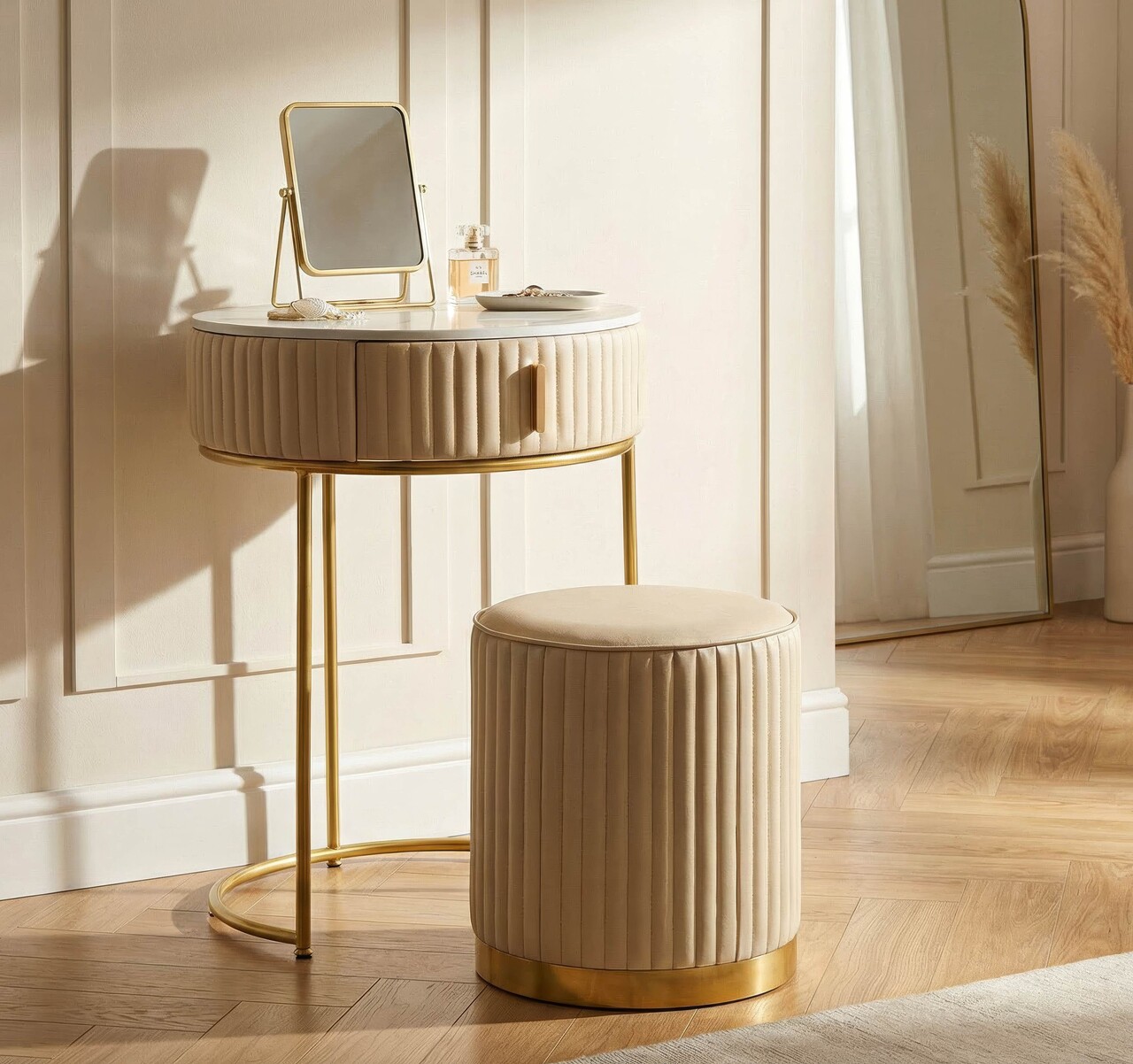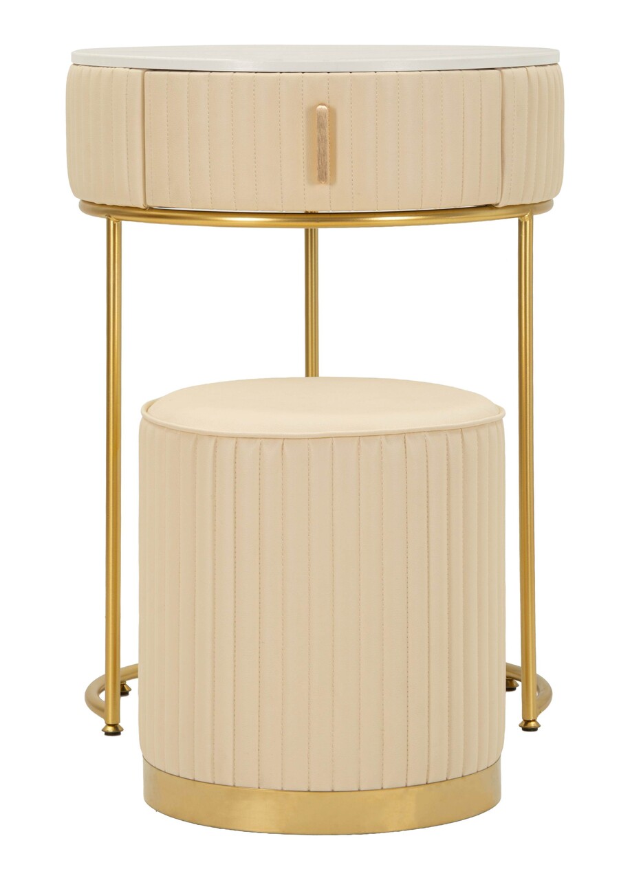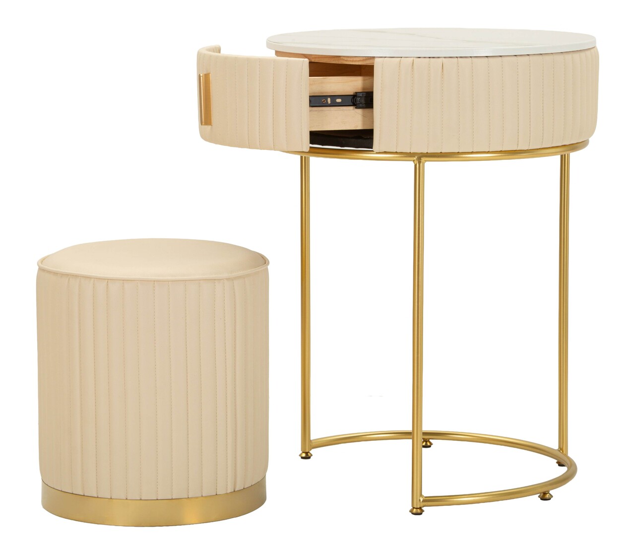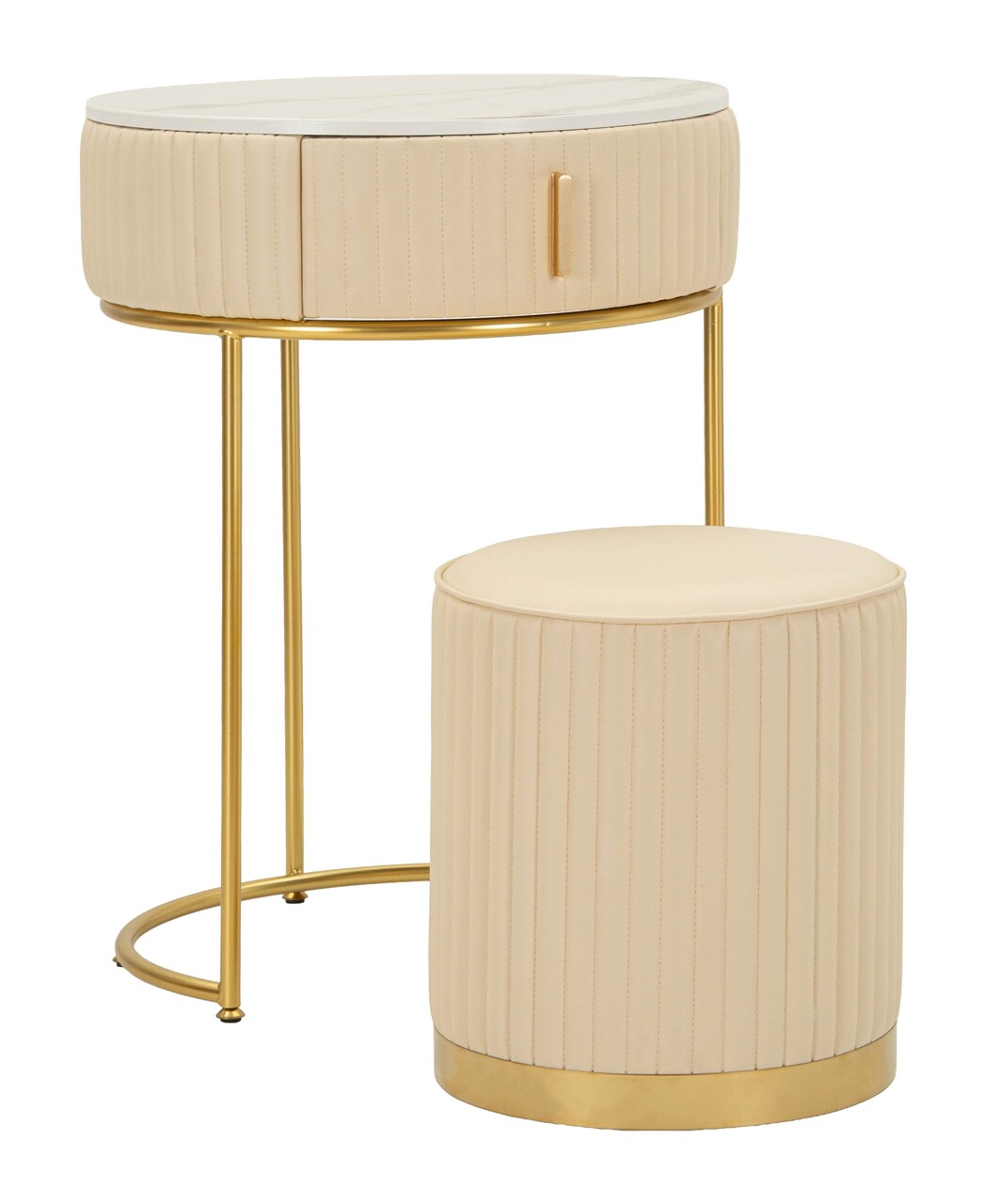 Set masuta dressing si taburet, Mauro Ferretti, Pok, 52x52x70 cm, lemn de pin/piele ecologica, alb/auriu
