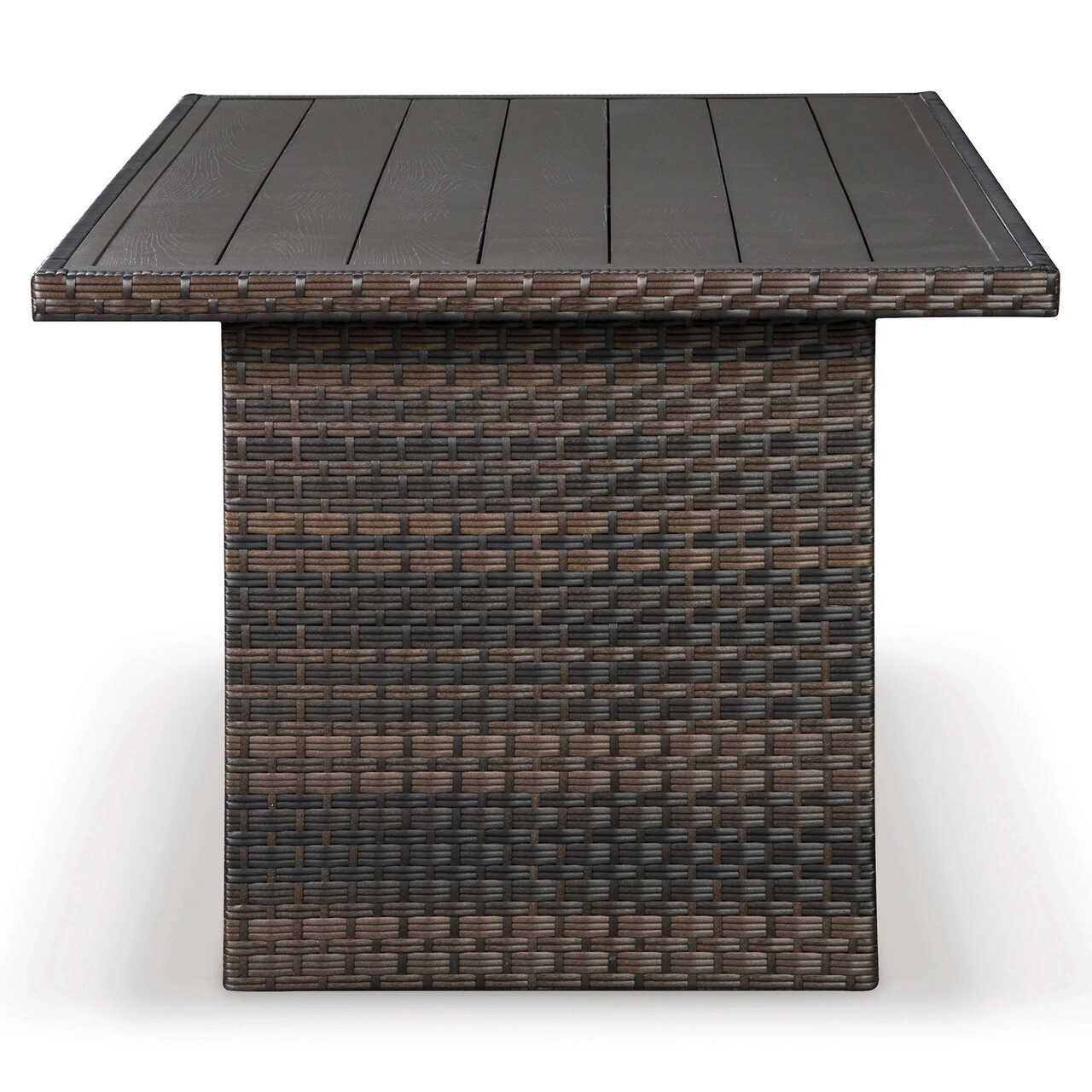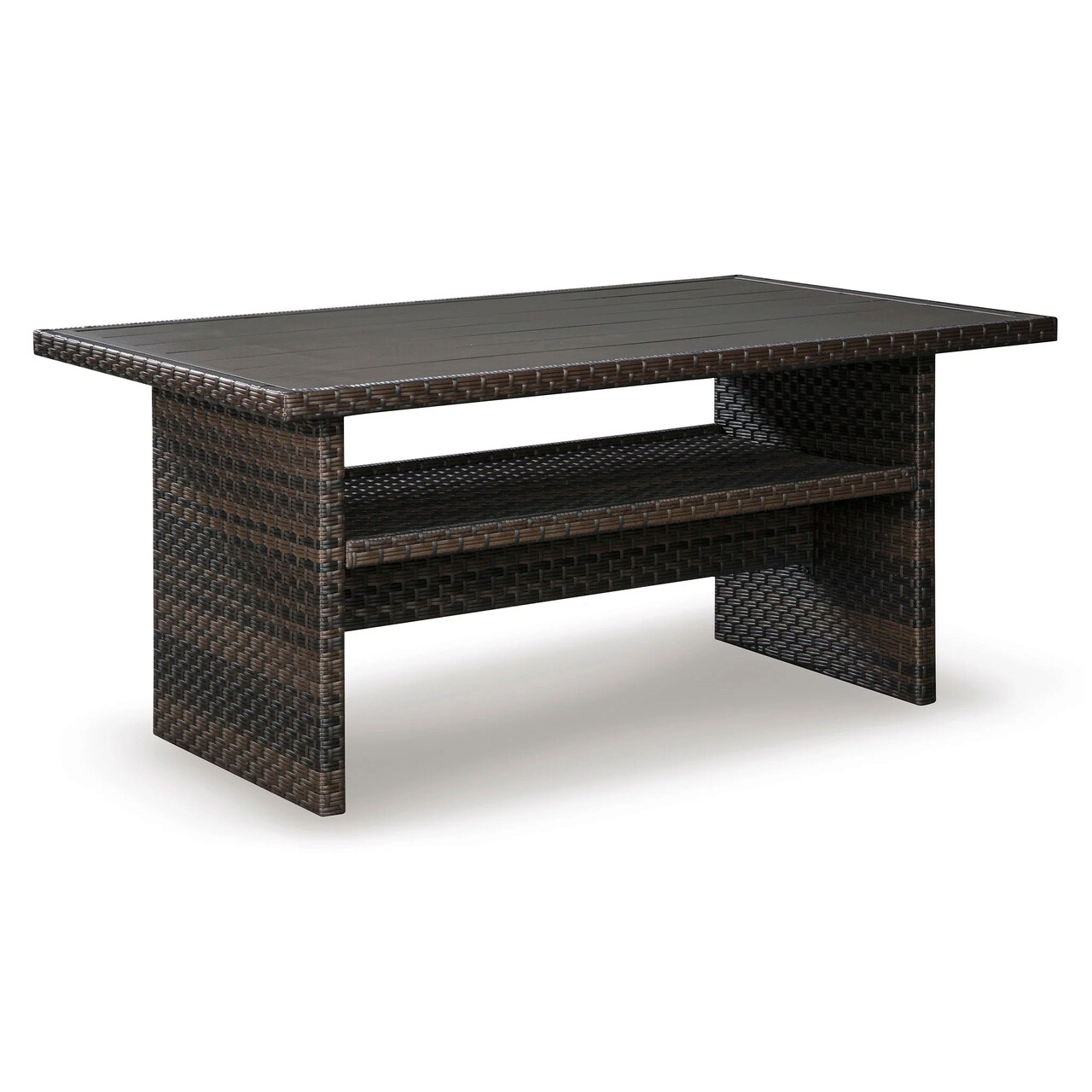 Realizat din structura solida de aluminiu impletita cu fibre sintetice ce imita ratanul cu protectie UV. Topul mesei este realizat din imitatie lemn (polywood). Masa: 149.5x85x70.5 cm