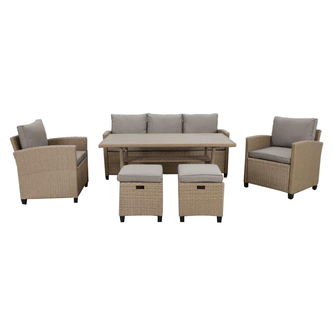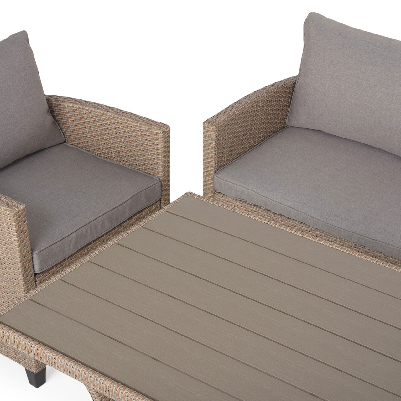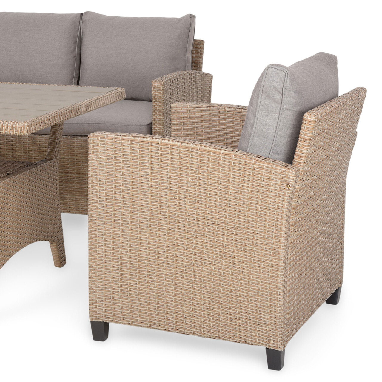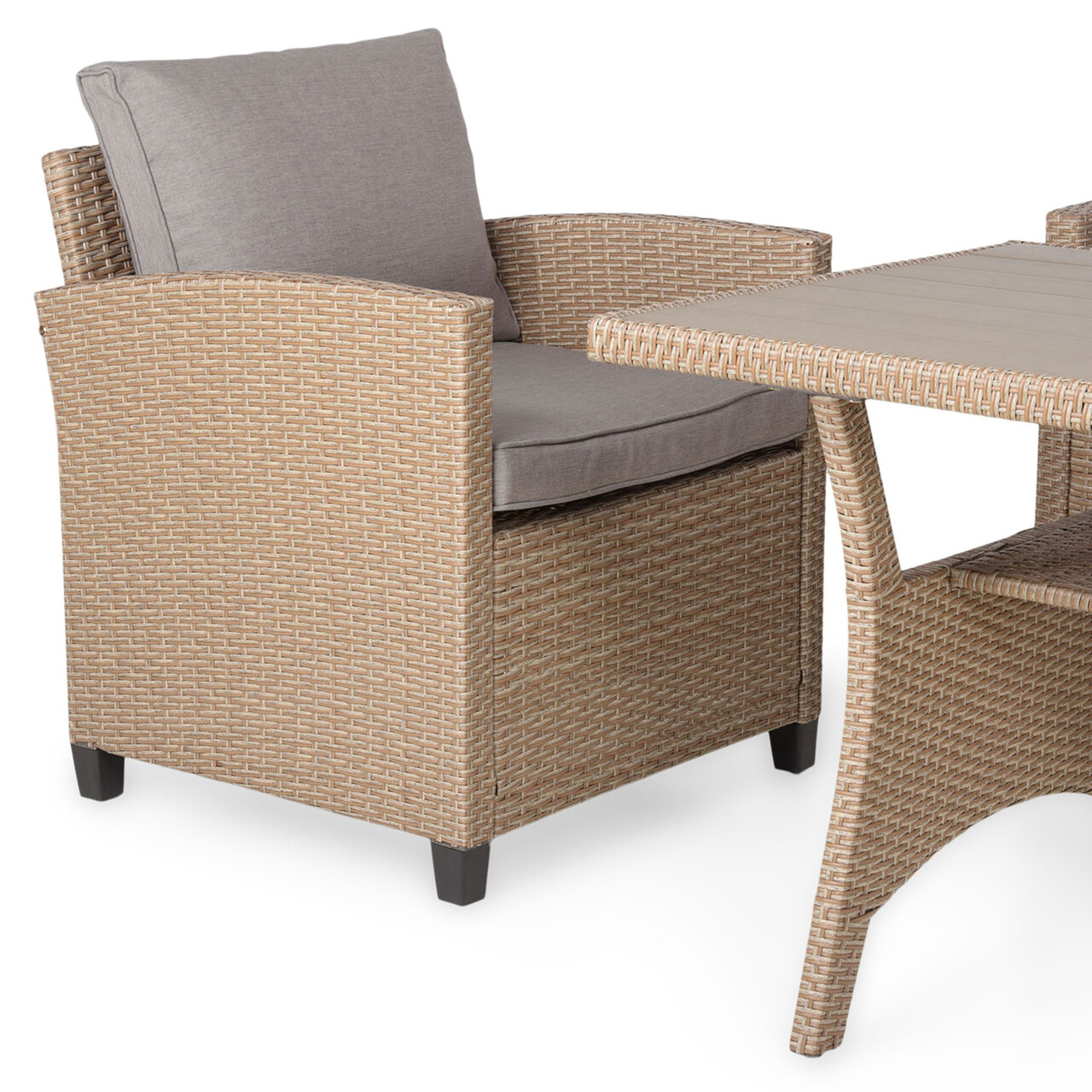 Realizat din structura de otel vopsita in camp electrostatic si impletita cu fibre sintetice tratate UV ce imita ratanul. Include perne din poliester 230 g cu protectie impotriva umezelii si a decolorarii. Husele sunt prevazute cu fermoar pentru a fi mai usor de indepartat si curatat. Topul mesei este realizat din imitatie lemn.