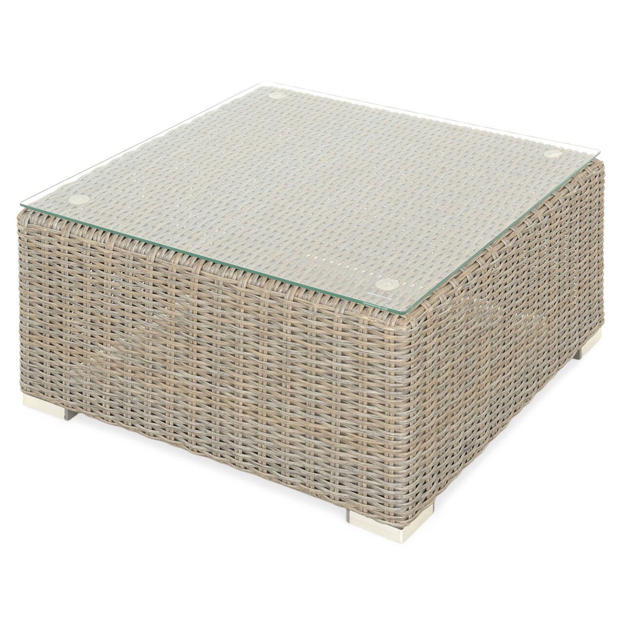 Realizat din structura solida de aluminiu vopsita in camp electrostatic si impletita cu fibre sintetice tip 'half round' cu protectie UV ce imi ratanul. Include perne imbracata cu tesatura poliester cu protectie impotriva umezelii si a razelor UV. Husele sunt prevazute cu fermoar pentru a fi mai usor de indepartat si curatat. Topul masutei este prevazut cu sticla securizata .