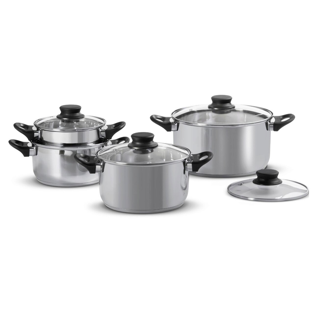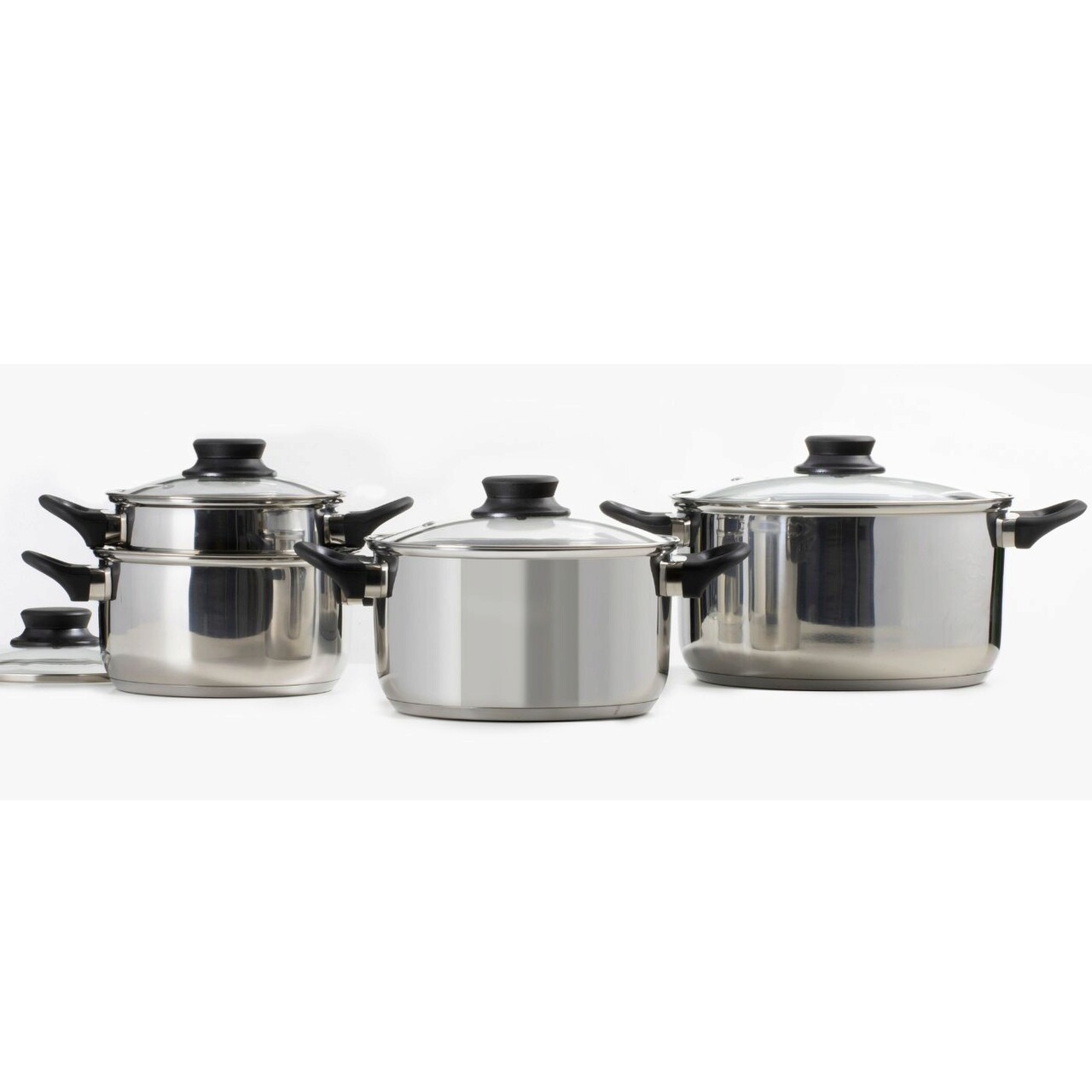 Setul de oale Domotti Lima este fabricat din otel inoxidabil cu capace din sticla securizata. Grosimea peretilor este de 0.4 mm si au un marcaj de capacitate care ajuta la masurarea cantitatii potrivite de lichid. Oalele sunt potrivite pentru toate tipurile de aragaz, inclusiv plitele cu inductie si sunt compatibile pentru masina de spalat vase.