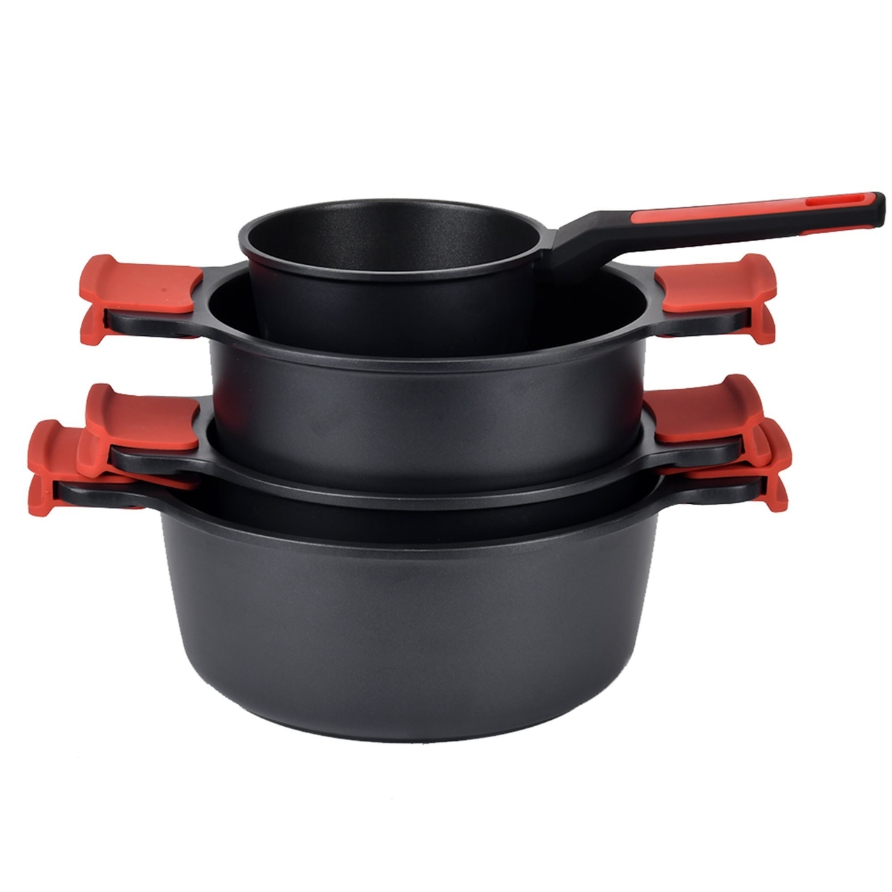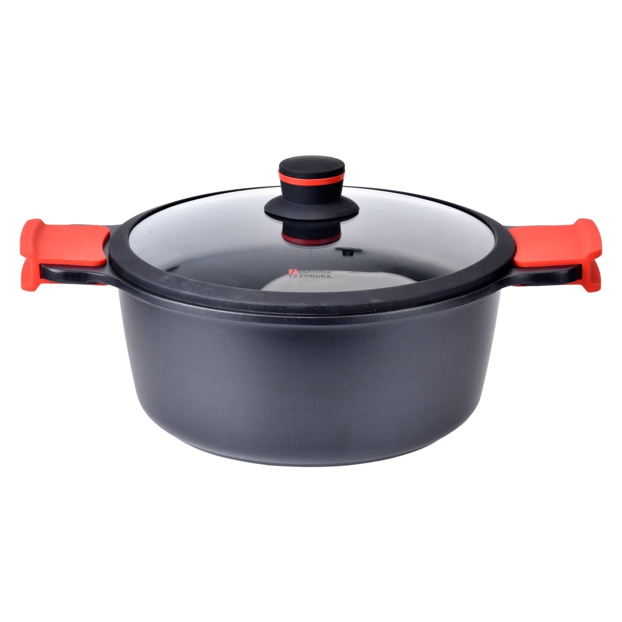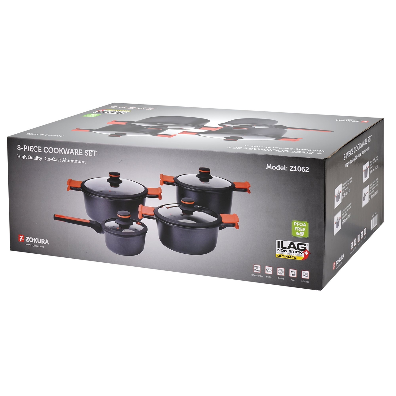 Set vase de gatit Noble, 8 piese, Marca Zokura, Fabricate din Aluminiu turnat, Acoperite cu strat antiaderent triplu Ilag.