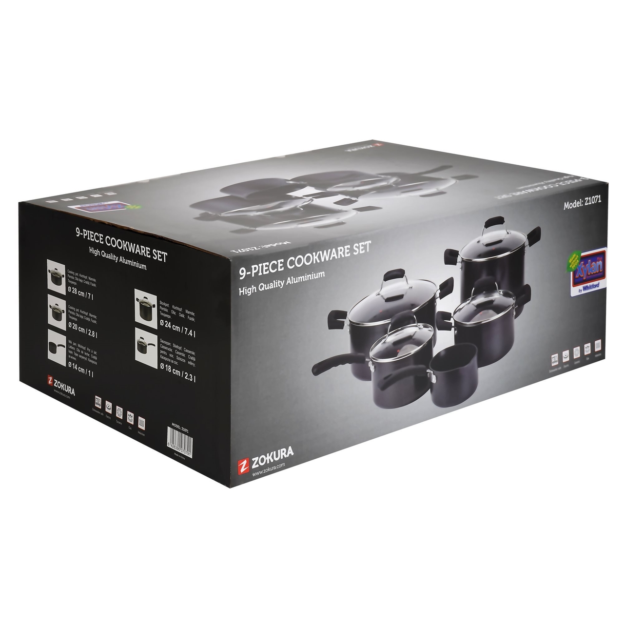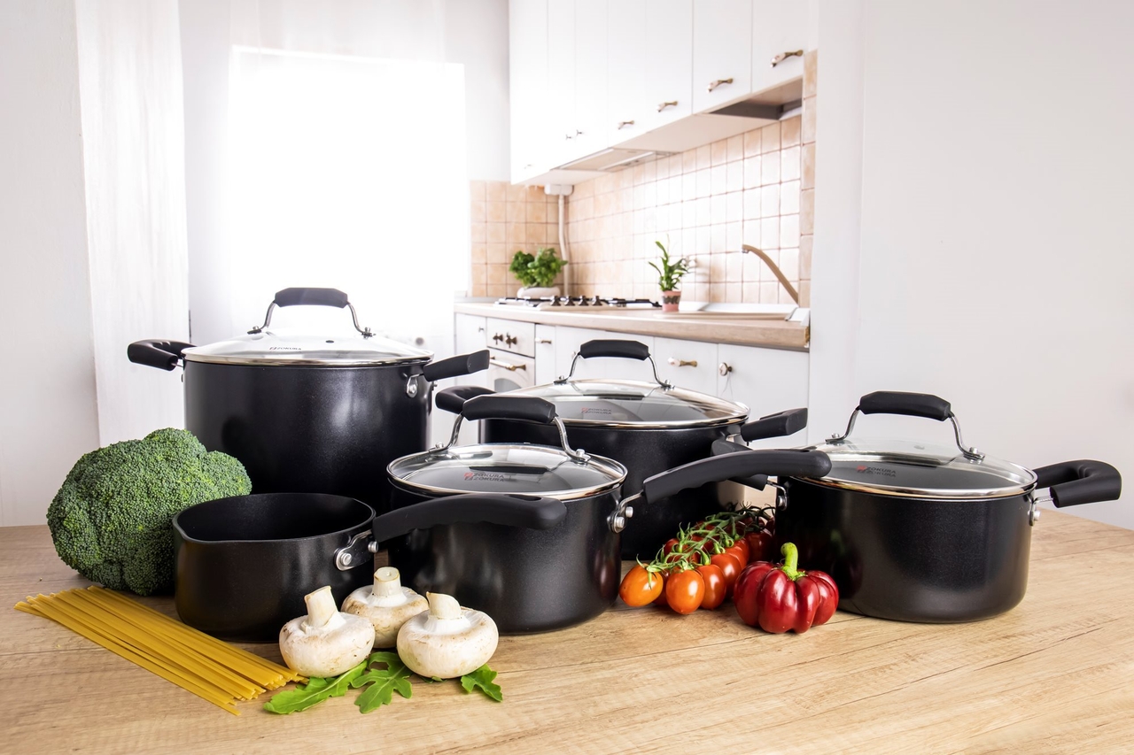 Toate vasele sunt fabricate din aluminiu presat, cu strat antiaderent Xylan Plus.