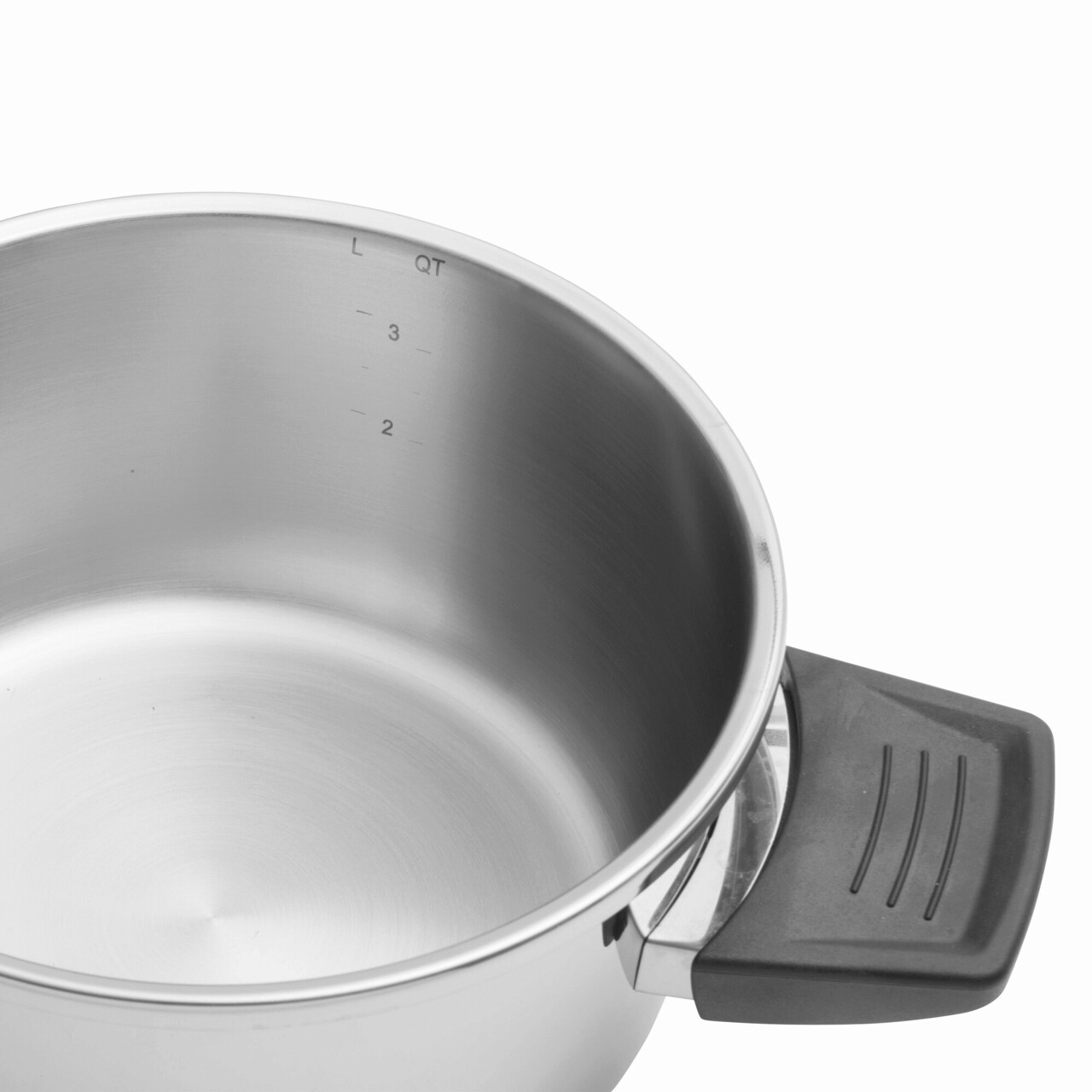 Setul include o oala de 4 litri si una de 7 litri din otel inoxidabil, un capac sub presiune si un capac de sticla, permitandu-va sa folositi oalele si pentru gatitul obisnuit. Vasele au indicatori de masurare in interior si sunt potrivite pentru toate plitele, inclusiv pentru inductie. Blocati capacul si gatiti legumele, prajiti carnea sau rumeniti ceapa intr-o clipita, datorita bazei care transfera caldura rapid si uniform pe toata suprafata.