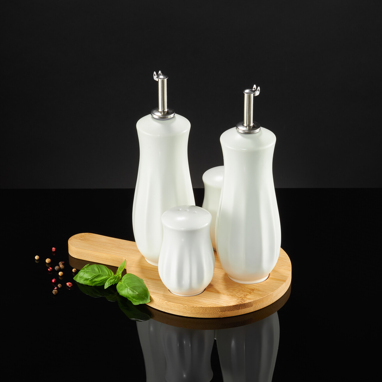 Un set de recipiente din portelan pentru ulei, otet, sare si piper. Toate elementele sunt montate pe o tava din lemn. Combinatia de portelan alb cu o culoare calda a lemnului este atemporala si universala. Setul se va potrivi pe orice masa.