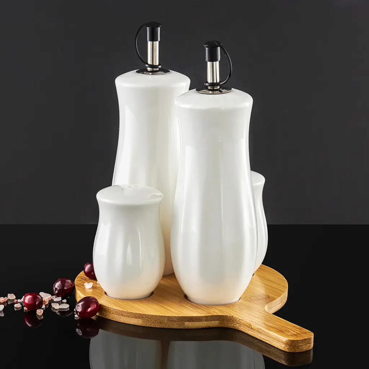 Un set de recipiente din portelan pentru ulei, otet, sare si piper. Toate elementele sunt montate pe o tava din bambus Combinatia de portelan alb cu o culoare calda a lemnului este atemporala si universala. Setul se va potrivi pe orice masa.