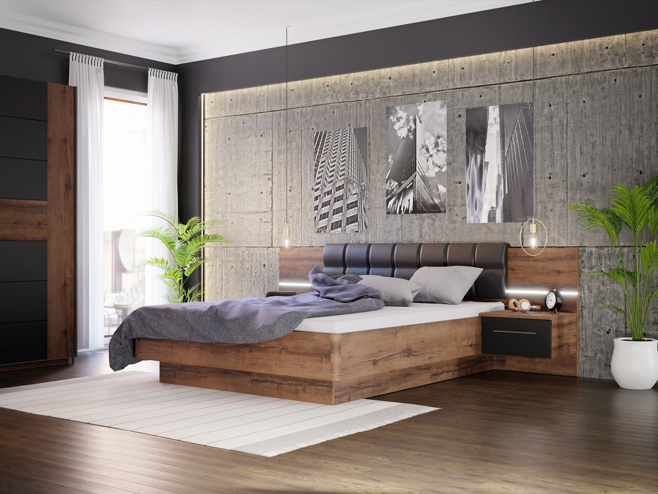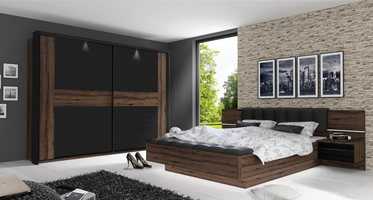 Set pat cu noptiere Rheden, Bedora, 265.8x207x90 cm, MDF/PAL/plastic, maro/negru