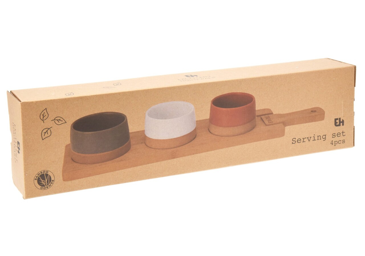 Set pentru servire aperitive 4 piese, Excellent Houseware, 48x12x1.5 cm / 9.5x4.5 cm, bambus/portelan, multicolor