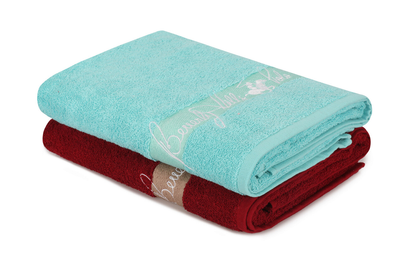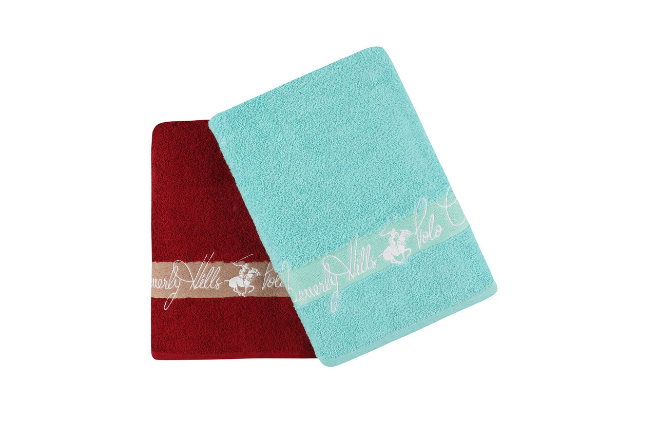 Set prosoape de baie 2 piese, Beverly Hills Polo Club, 409, Bumbac, Albastru Petrol / Roșu Claret