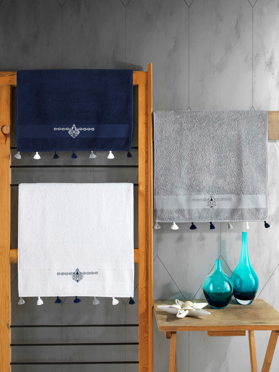 Set prosoape de baie 3 piese, Cotton Box, Asorti, Bumbac, Albastru închis / Alb / Gri