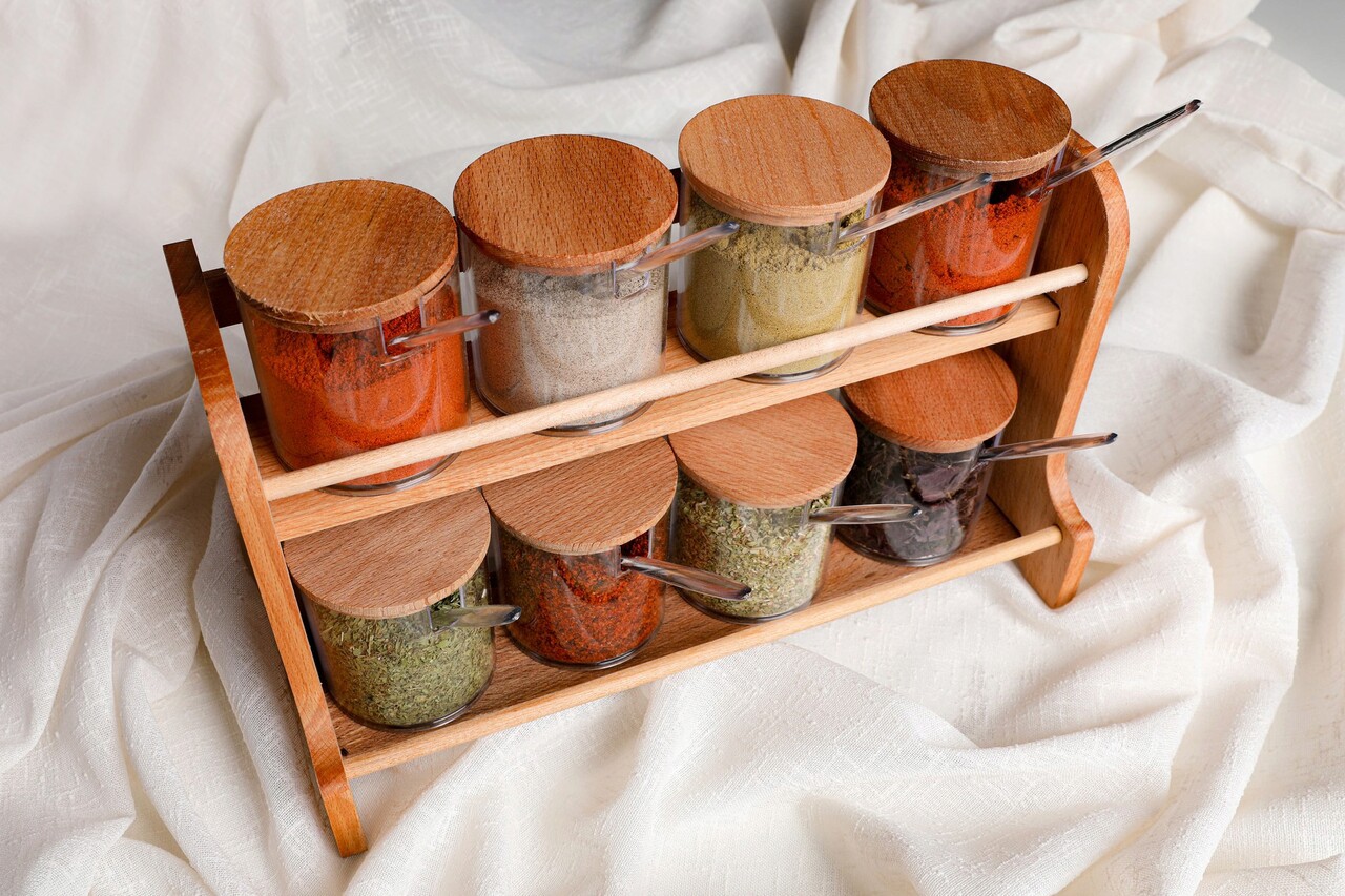 Set recipiente pentru condimente cu suport, Plasberg, 619PLS1111, Plastic, Maro/Transparent