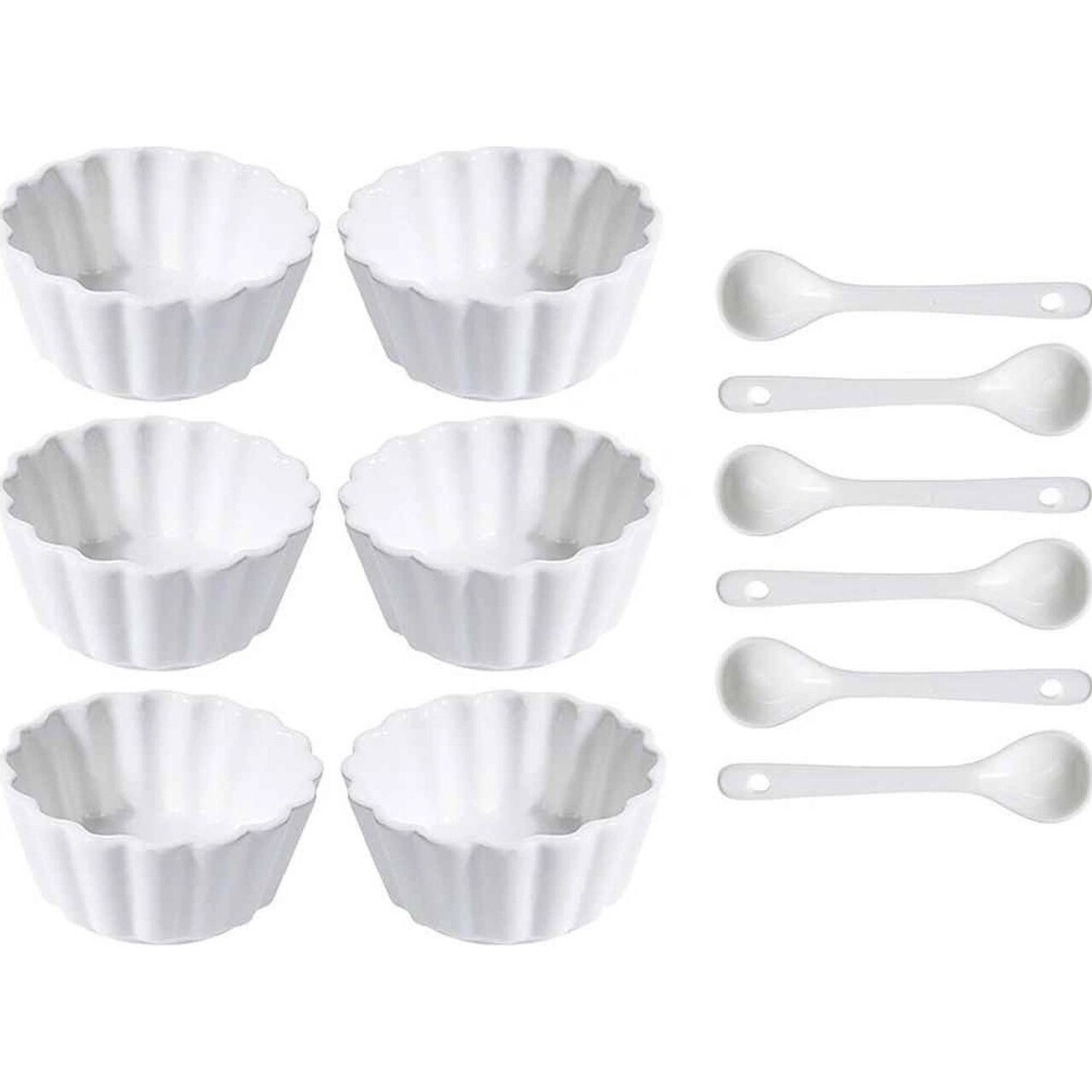 Setul de boluri din portelan cu lingura este excelent pentru a servi o varietate de feluri de mancare, cum ar fi gustari, aperitive sau deserturi. Bolurile sunt realizate din portelan alb, sunt rezistente la caldura si pot fi folosite si pentru coacere in cuptor. Fiecare bol masoara 9 x 4 cm si poate fi spalat in masina de spalat vase. Setul contine 6 boluri si 6 linguri. Perfect pentru utilizare zilnica sau ocazii festive.