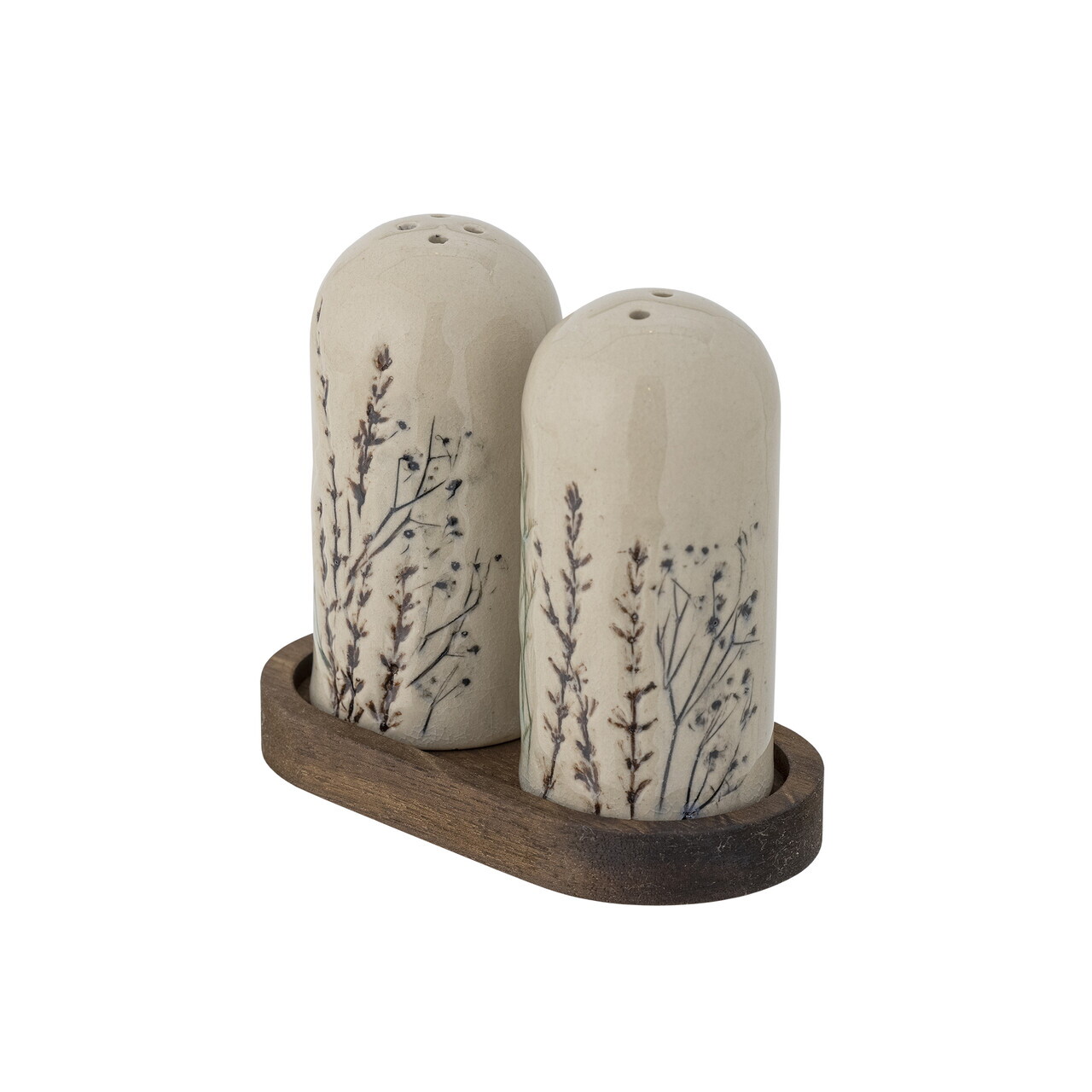 Set solnita si pipernita in suport, Bloomingville, Bea, 12.5x5.5x11 cm, 50 ml, ceramica/lemn de salcam, natural