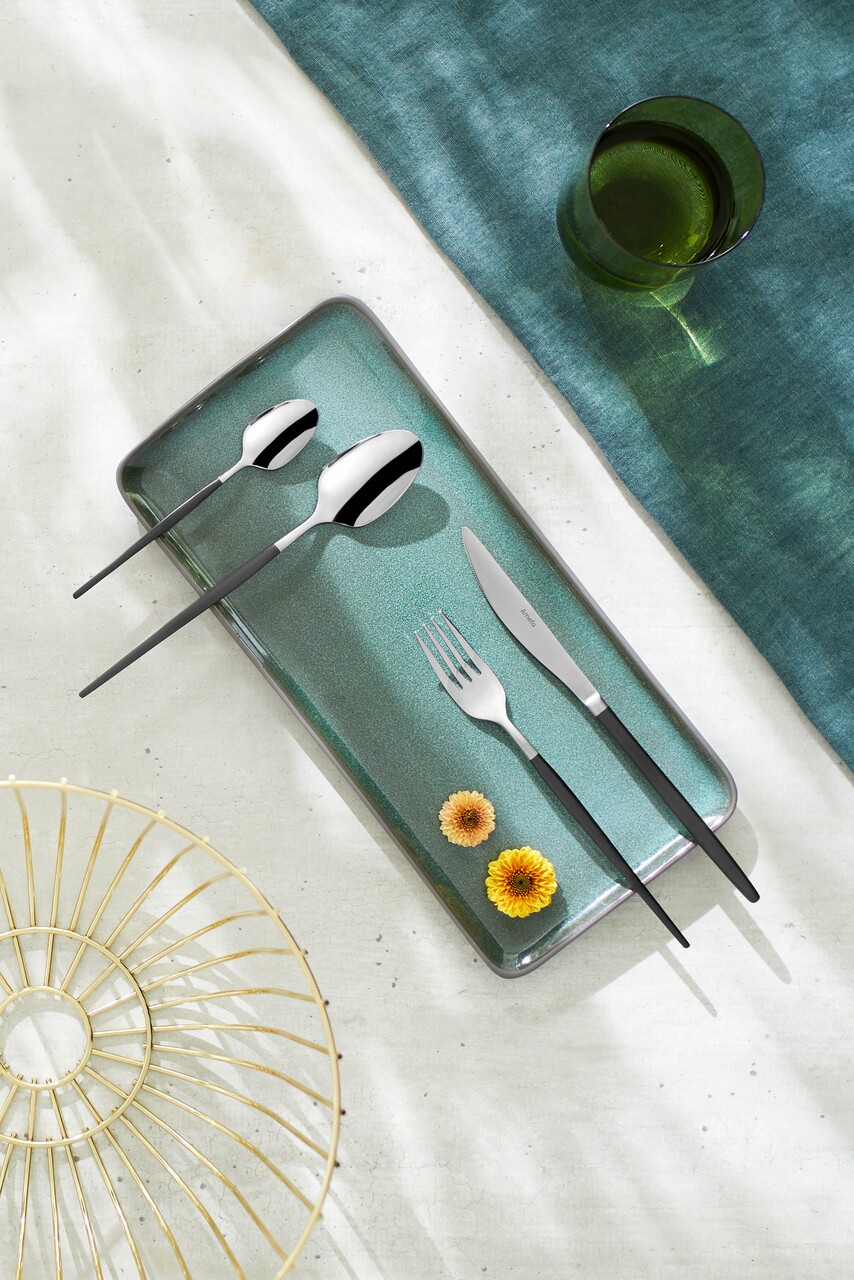 Un set de tacamuri cu un design curat care se remarca prin modernitate si linii subtiri. Este realizat din otel inoxidabil 18/0 cu finisaj PVD negru pe manere, ceea ce aduce un aspect contemporan mesei.