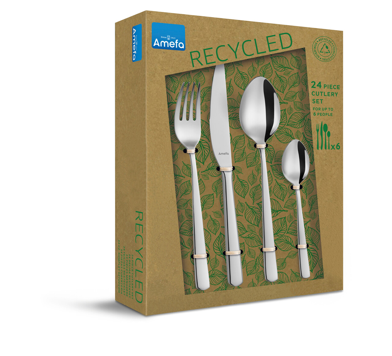 Aceste tacamuri sunt fabricate din cel putin 80% otel inoxidabil reciclat. Acest lucru garanteaza aceeasi functionalitate ca si tacamurile obisnuite. Utilizarea materialelor reciclate reduce semnificativ cantitatea de energie si materii prime necesare pentru productie. In plus, otelul inoxidabil poate fi reciclat in totalitate la sfarsitul ciclului sau de viata.