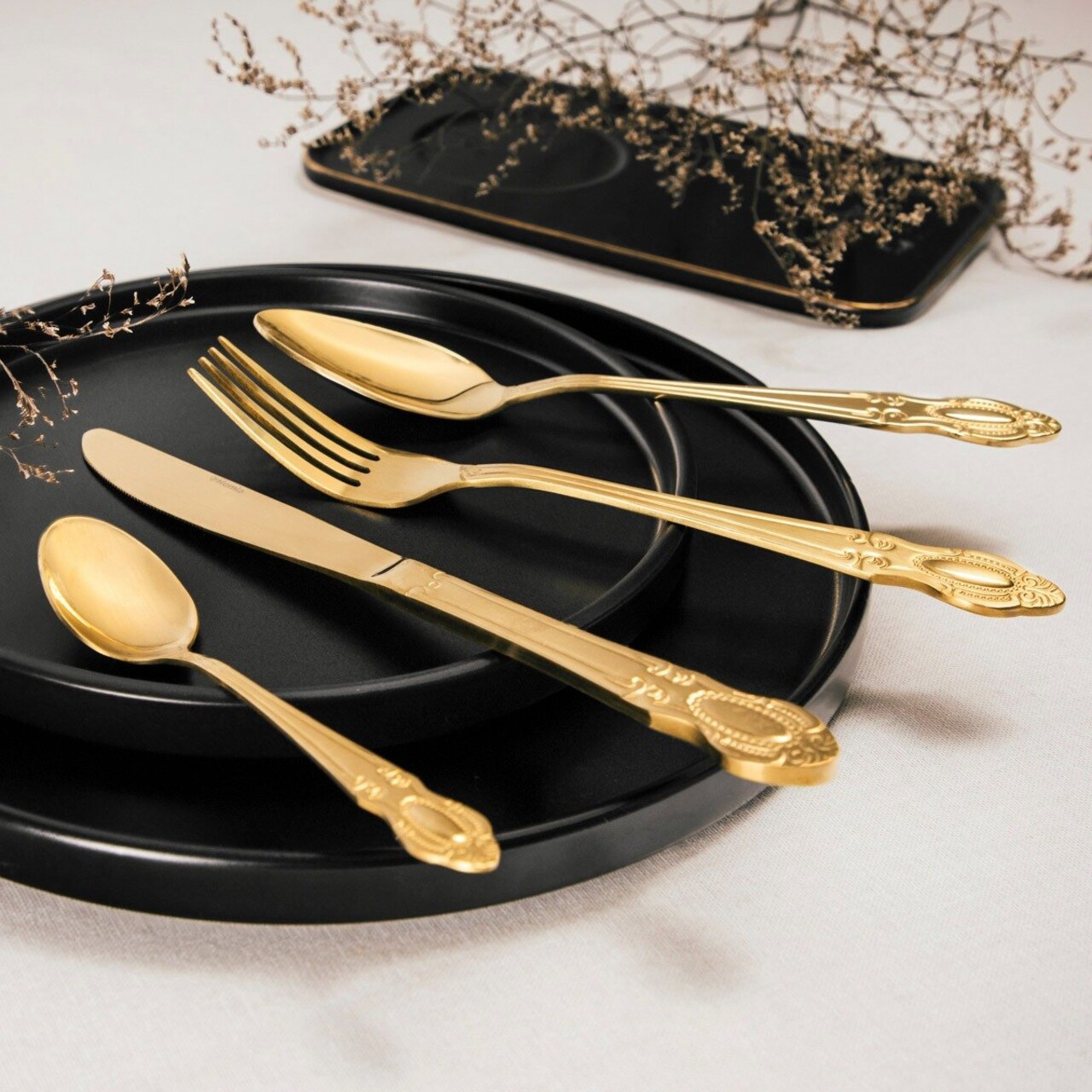 Setul de tacamuri din 24 de piese este perfect pentru bucataria si sufrageria dumneavoastra. Acesta va arata frumos atat pentru mesele de zi cu zi, cat si pentru petreceri si sarbatori speciale. Tacamurile aurii cu decor decorativ reprezinta un accent deosebit de elegant pe vesela dumneavoastra.