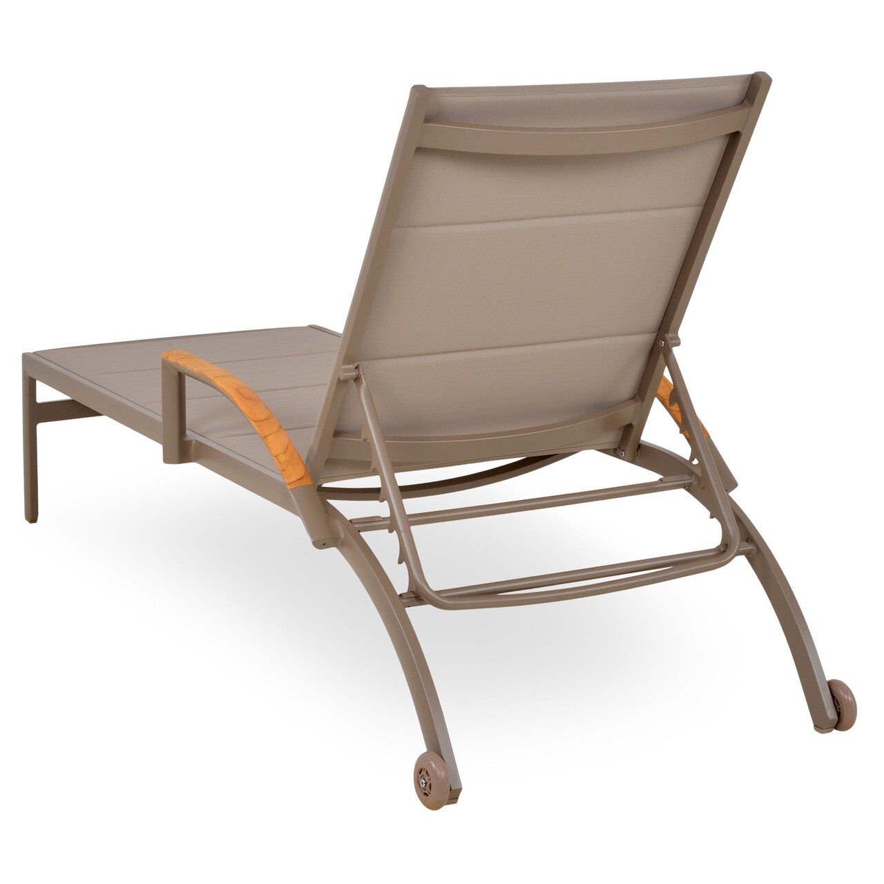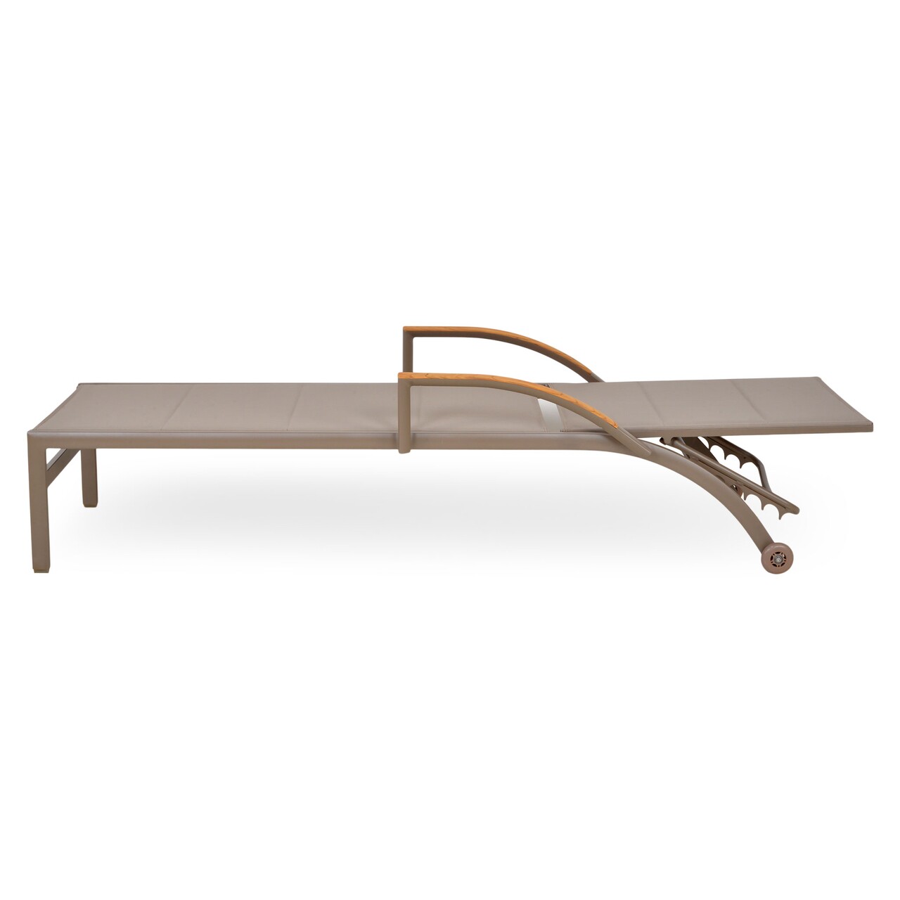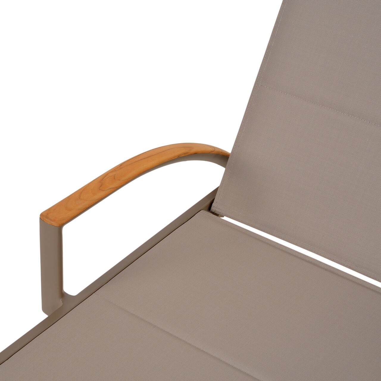Realizat din structura de aluminiu vopsita in camp electrostatic. Sezutul si spatarul sunt realizate din textilina fina cu protectie UV. Bratele contin o insertie din lemn de teak. Prevazut cu roti.
