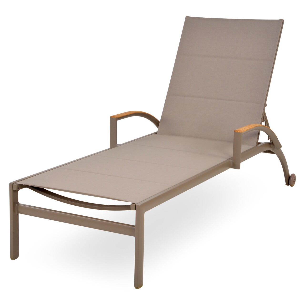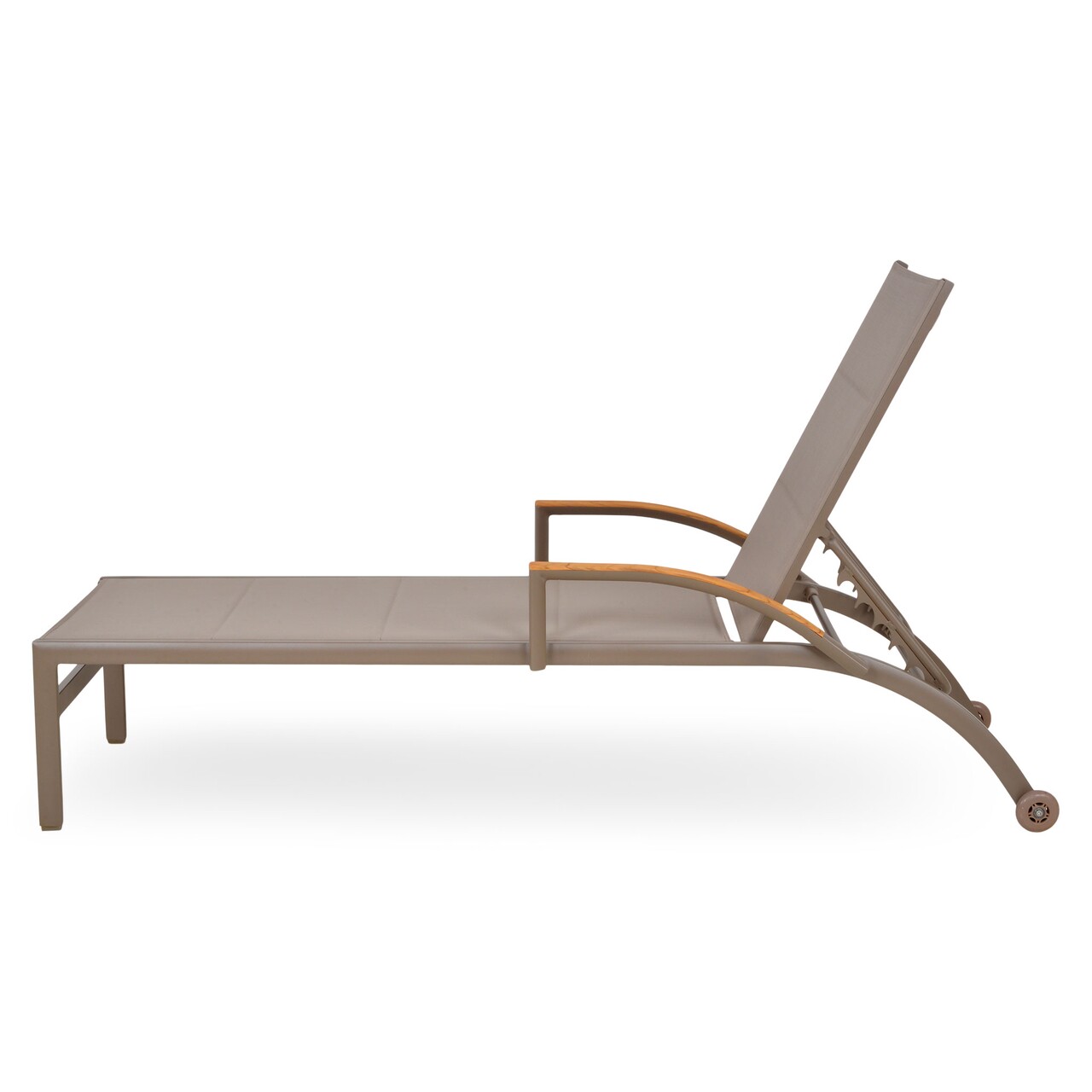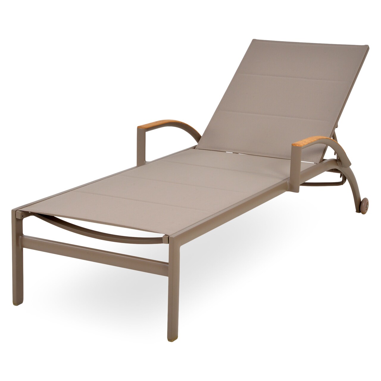 Realizat din structura de aluminiu vopsita in camp electrostatic. Sezutul si spatarul sunt realizate din textilina fina cu protectie UV. Bratele contin o insertie din lemn de teak. Prevazut cu roti.