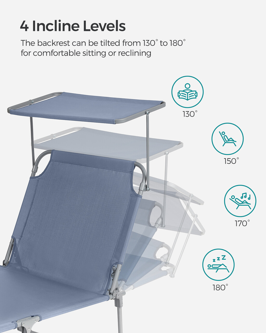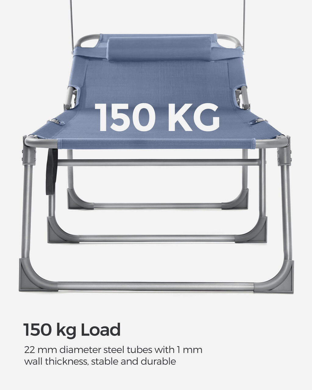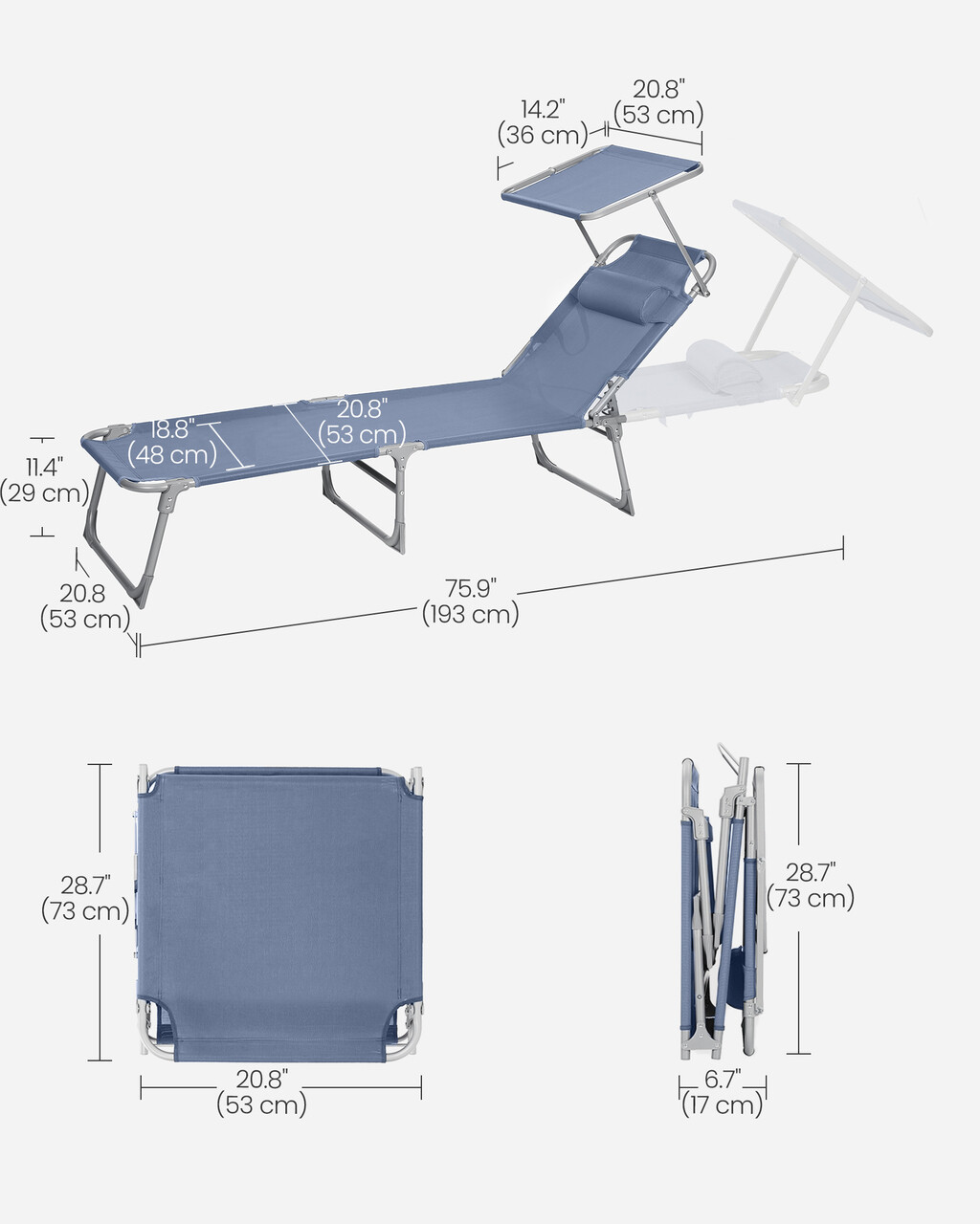 Sezlong pliabil cu parasolar si tetiera, Songmics, max 150 kg, 193x53x29.5 cm, albastru