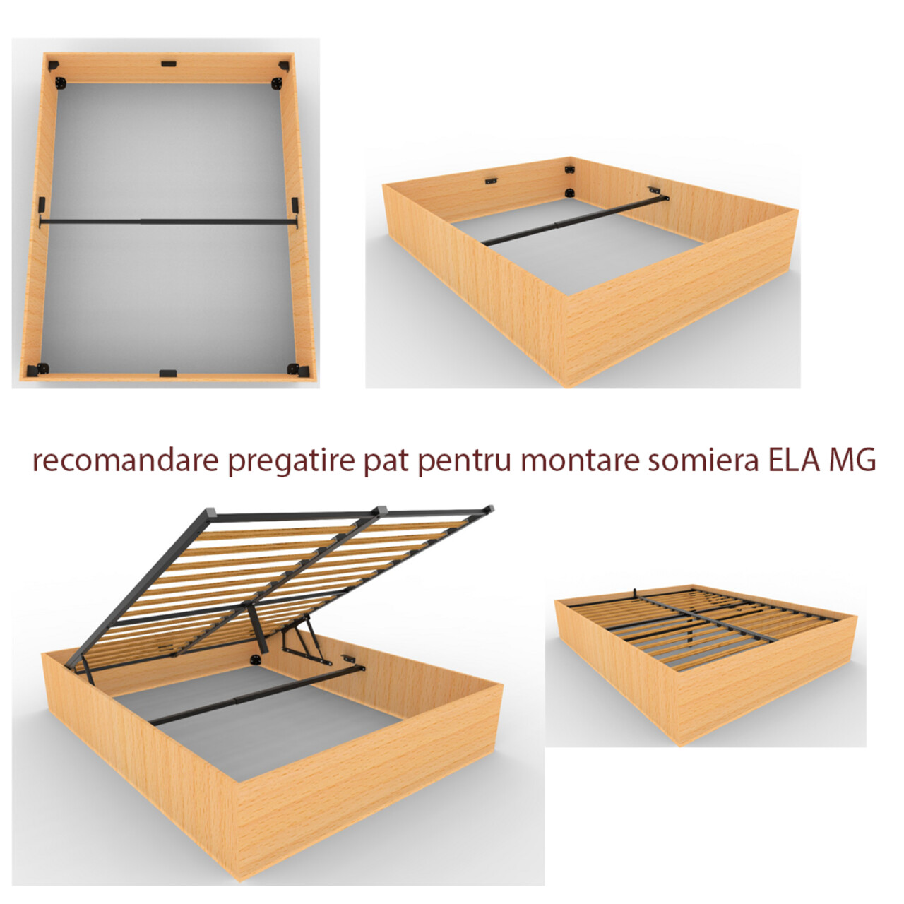 Somiera contine gaurile de fixare a mecanismului de rabatere. Somiera se livreaza dezasamblata, cu schita de montaj. Coletul include elementele de asamblare pentru somiere. Somiera si mecanismul de rabatare se vand separat.