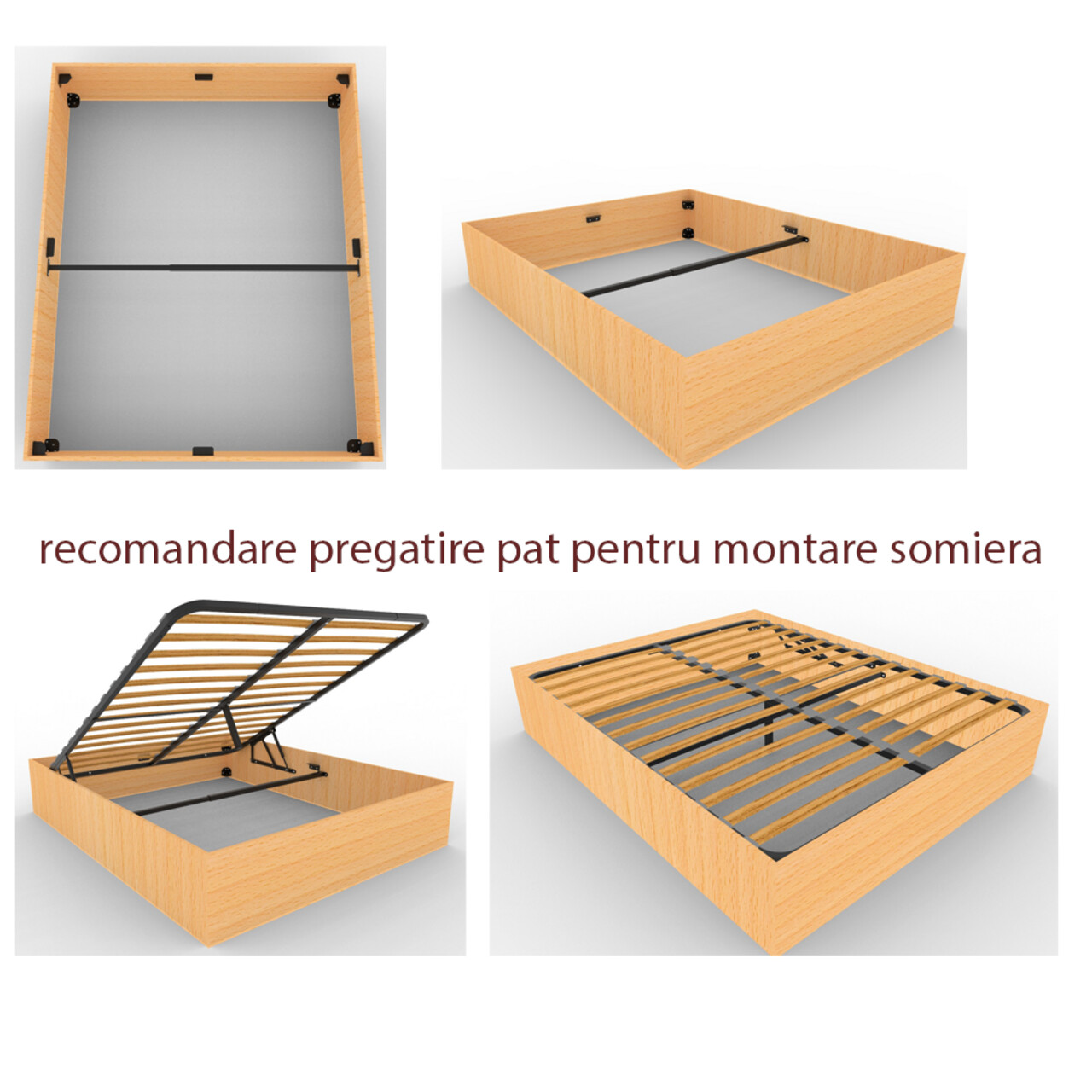 Se recomanda ca patul la care se monteaza somiera metalica modulara sa fie prevazut cu traversa metalica/lemn/pal, precum si elemente de sprijin pentru somiera – metalice/stinghii din lemn sau pal melaminat sau MDF, sa nu se sprijine somiera doar prin mecanismul de rabatare.