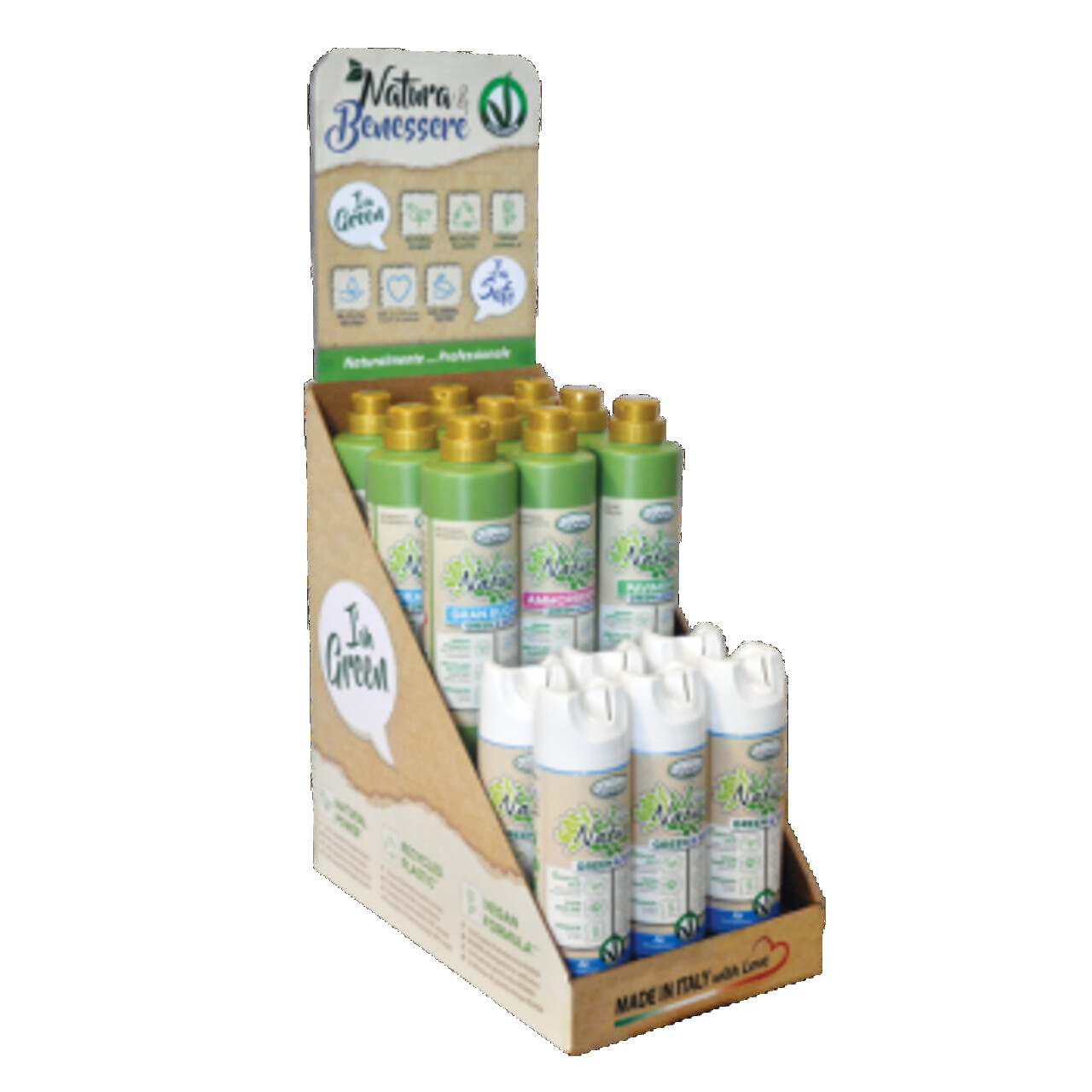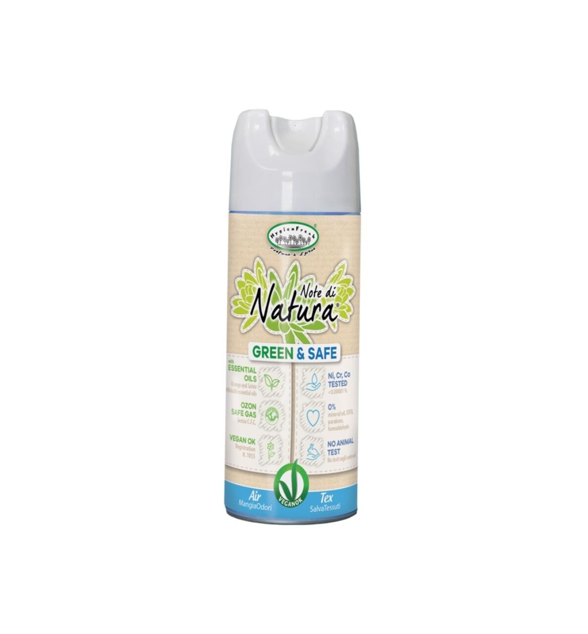 Deodorant spray pentru aer si tesaturi cu o formula speciala de protectie a tesaturilor si de eliminare a mirosurilor. Poate fi pulverizat pe toate tesaturile si in aer, pentru un parfum si protectie „Verde”. Elimina mirosurile neplacute si lasa un miros intens si de lunga durata. Produs profesional cu uleiuri esentiale de portocale si salvie.