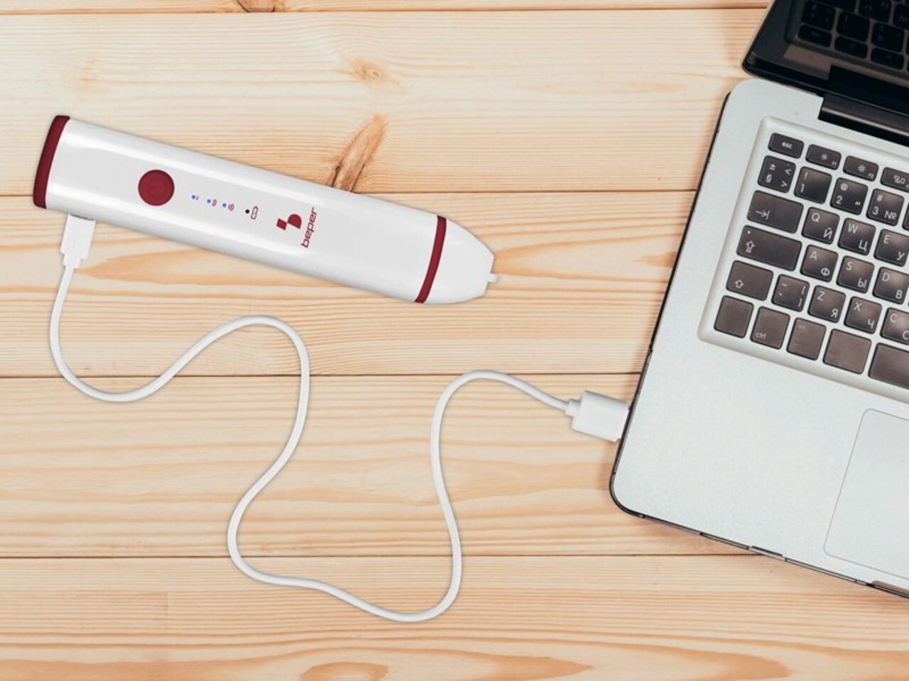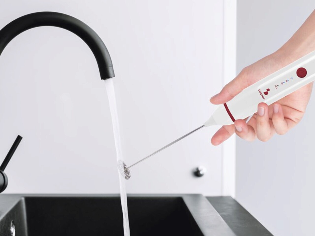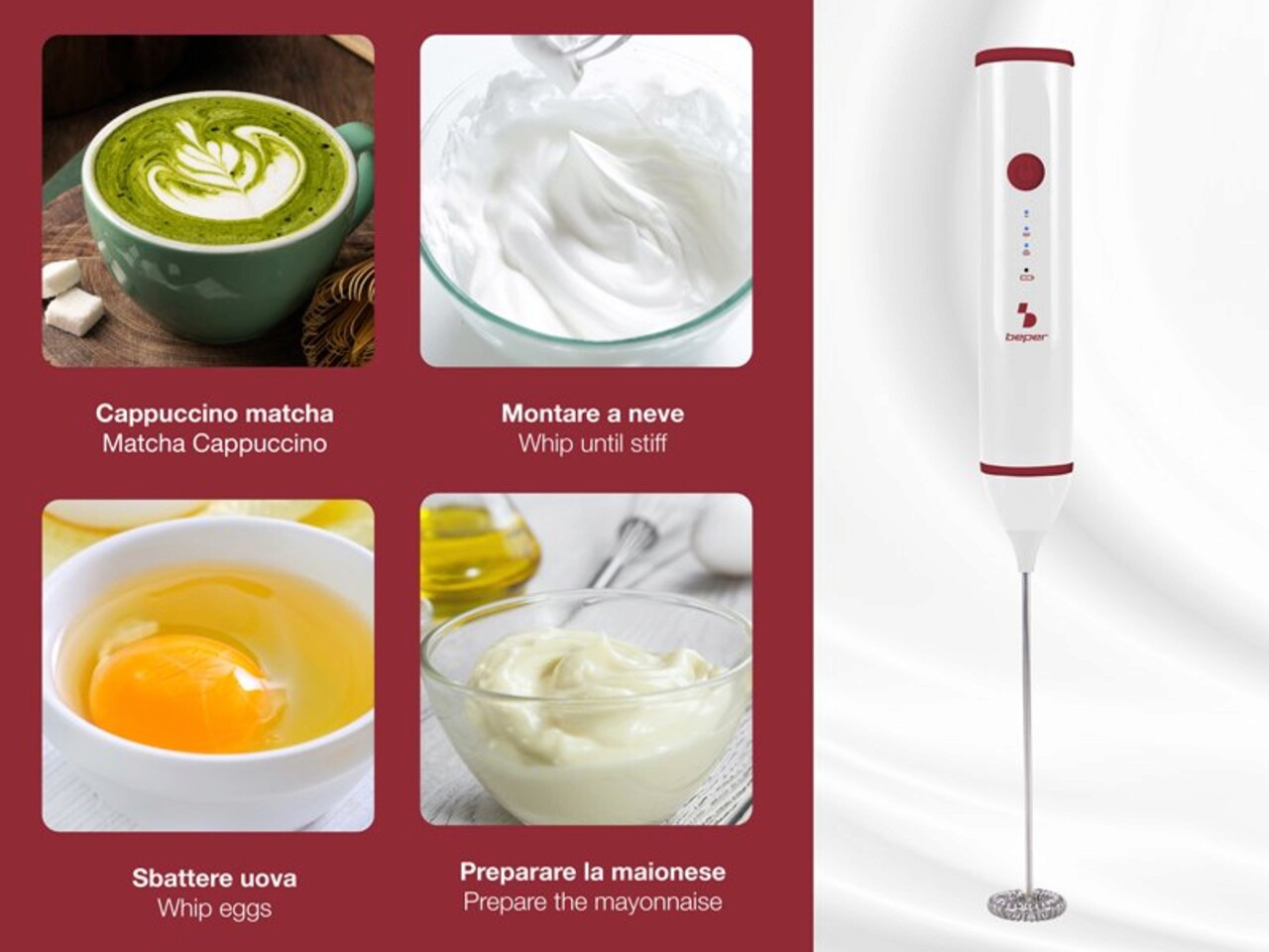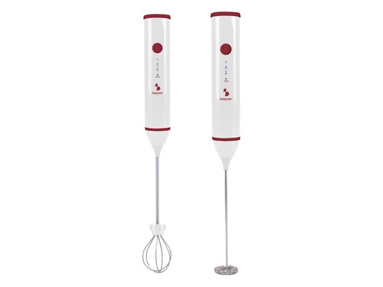 Spumator reincarcabil prin USB Beper, 3x3x28 cm, inox/plastic, alb/rosu