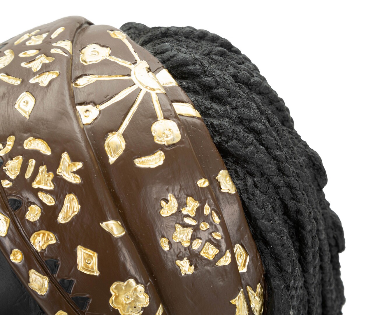 Statueta are forma unui cap de femeie cu o coafura si bijuterii inspirate de traditia triburilor primitive.