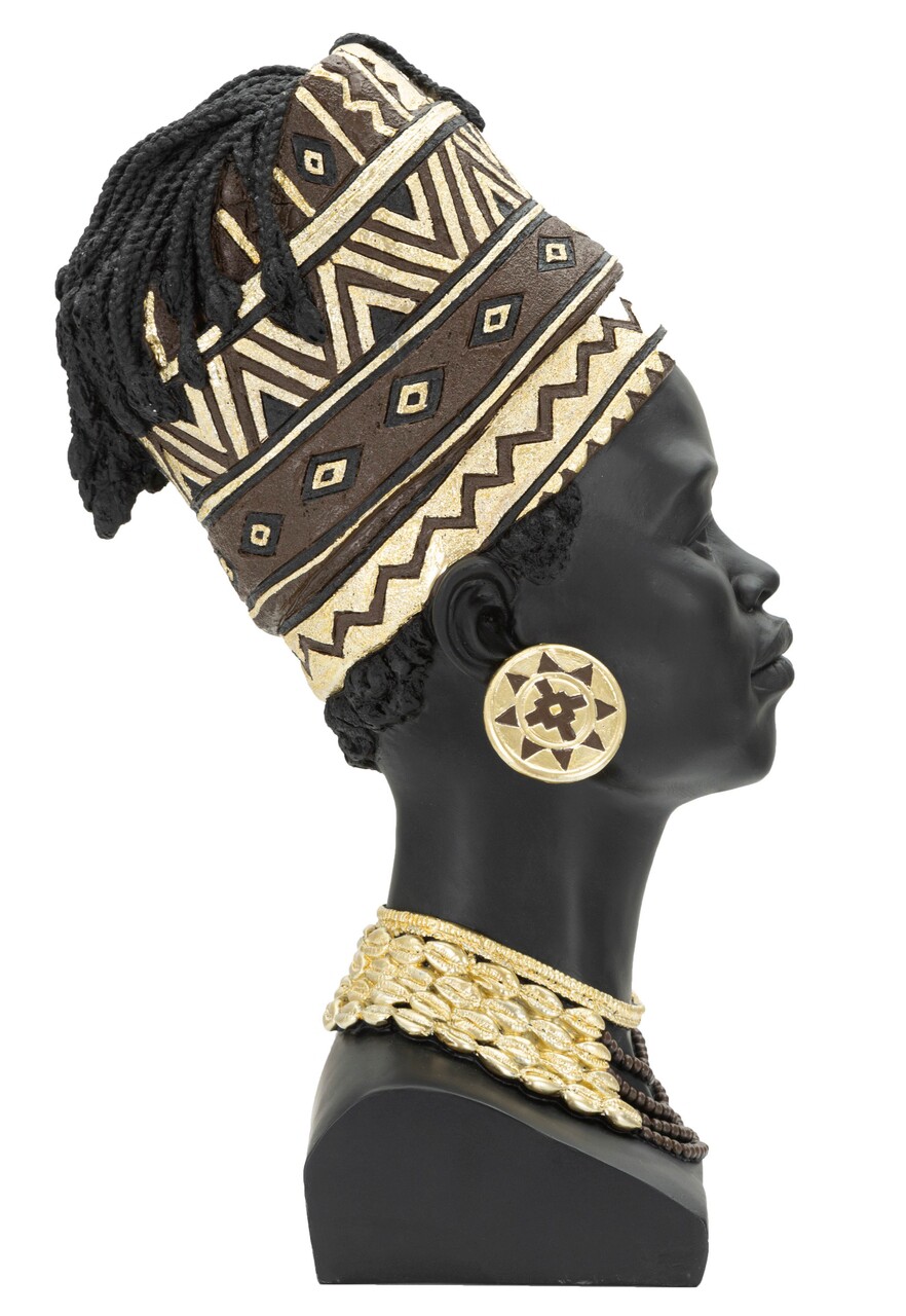 Statueta are forma unui cap de femeie cu coafura si bijuterii inspirata de traditia triburilor primitive.