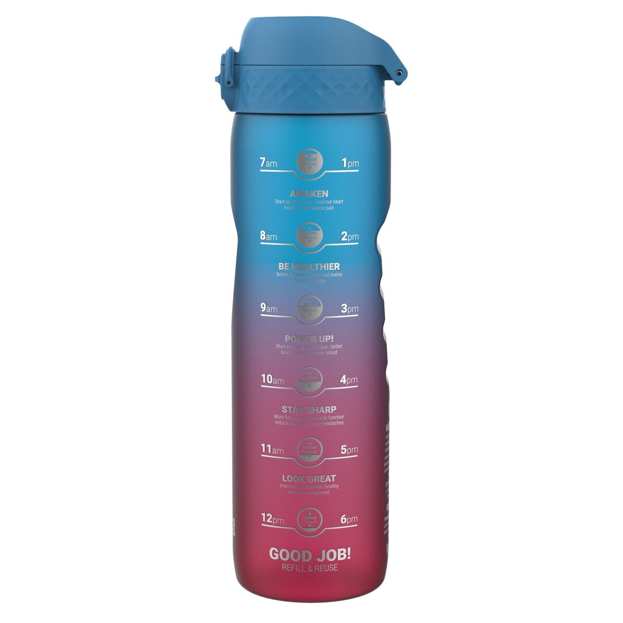 Sticla sport are o curgere lina pentru hidratare fara picurare si capac superior igienic cu deschidere completa pentru utilizare cu o singura mana, In timp ce mergeti.Pentru o hidratare corespunzatoare sticla are gradatii inscriptionate in ml si oz, Cat si un timer cu inscriptii motivationale ce te ajuta sa te mentii hidratat intrega zi, In timp ce urmaresti cu usurinta cata apa ai consumat.