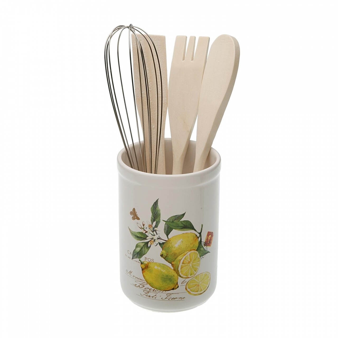Suport cu ustensile 5 piese, Lemons, Versa, 10 x 23 cm, lemn/ceramica, multicolor