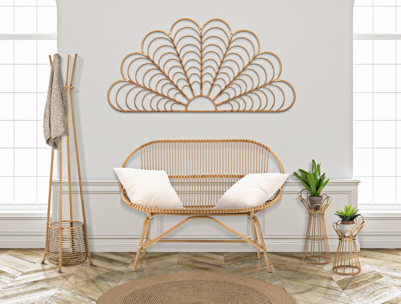 Suport de ghiveci rotund si elegant din metal cu finisaj din ratan, cu un design care seamana cu o floare.
