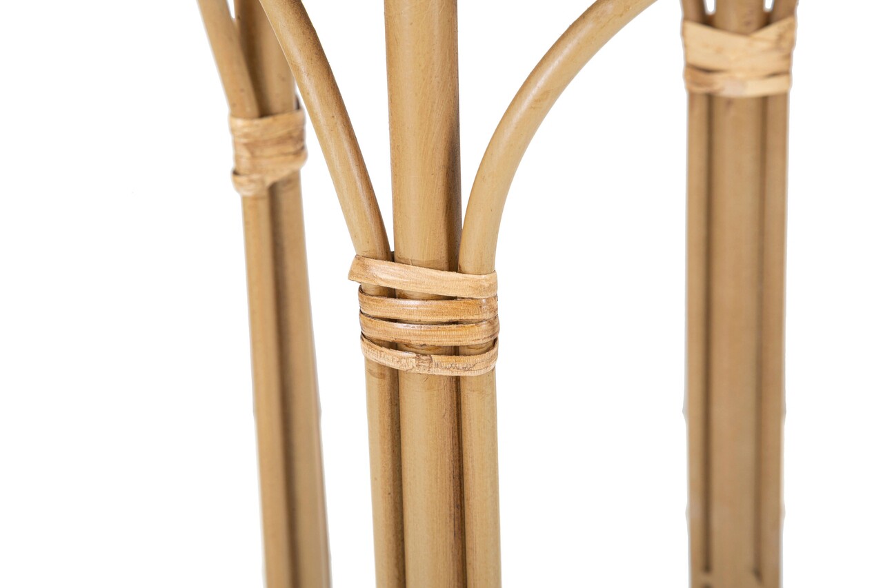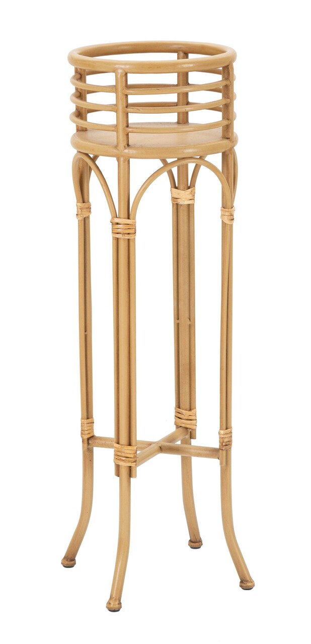 Ghiveci rotund din metal cu piedestal, cu ornamente din ratan. Designul simplu se potriveste perfect cu orice tip de mobilier.