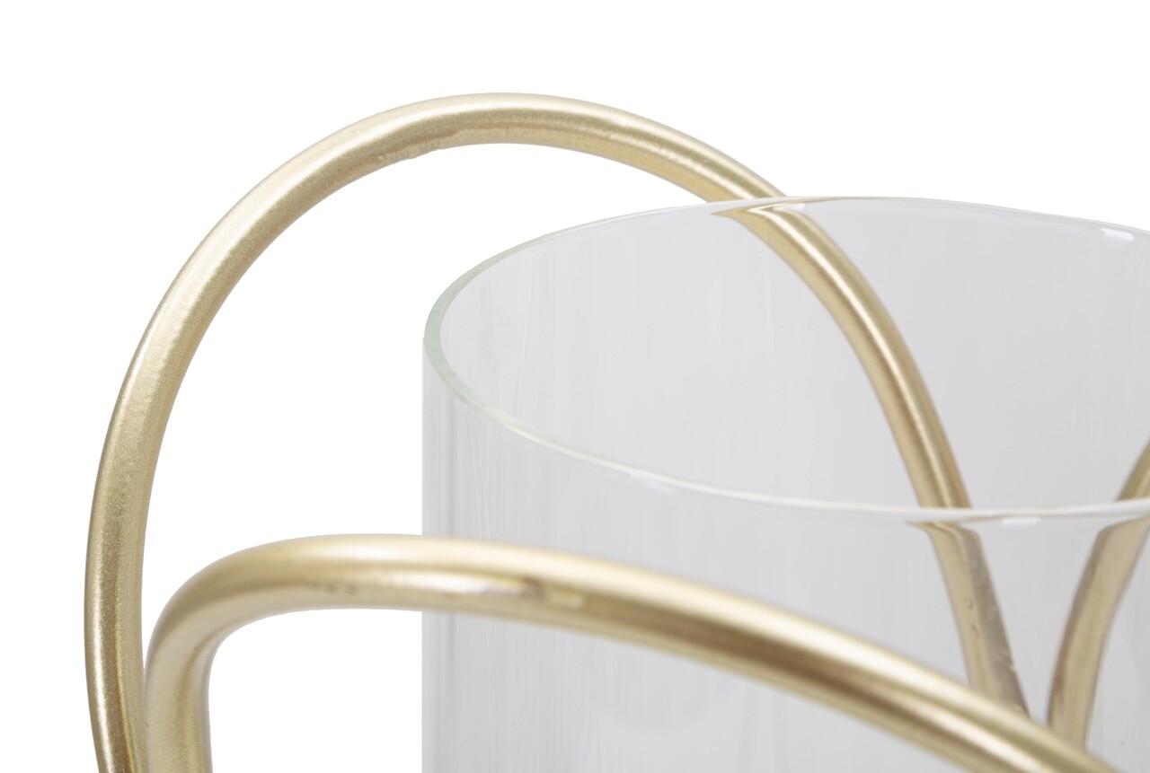 Suport de lumanari din metal auriu cu cupa din sticla cu un design geometric si linii elegante si sinuoase.