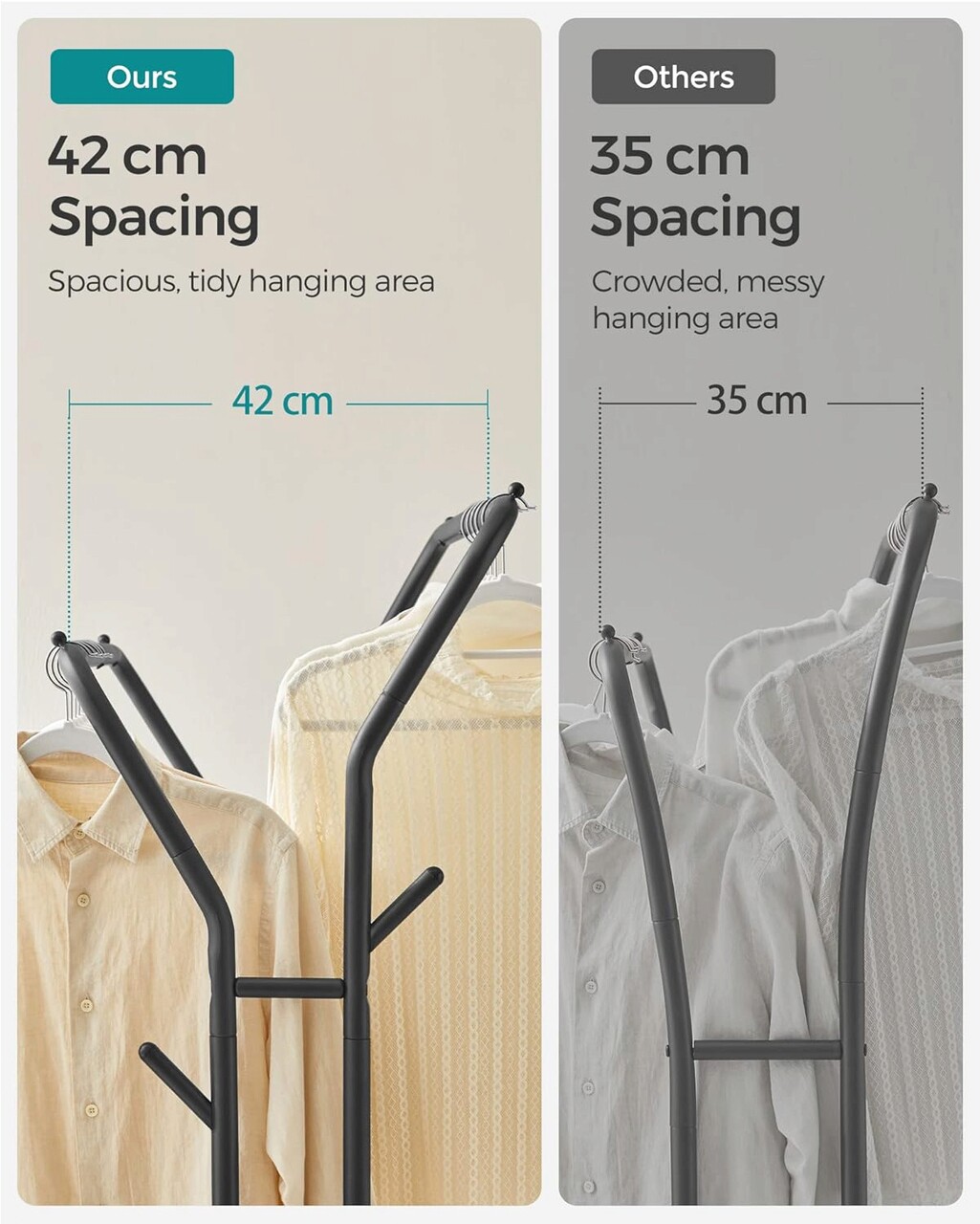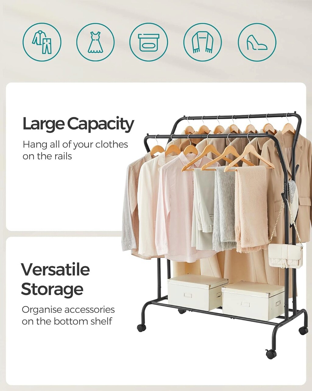 Depozitare versatila - Cu o sina inalta si una joasa pentru agatarea hainelor de diferite lungimi, carlige pe ambele parti pentru genti si palarii si un raft inferior pentru cutii si pantofi, acest suport de haine va pastreaza toate lucrurile esentiale intr-un singur loc.