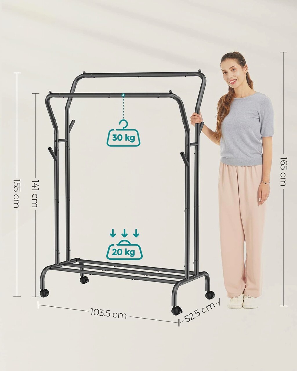 Usor de mutat si blocat - Glisati fara efort sina dubla pentru haine in orice camera din casa datorita celor 4 roti pivotante. 2 dintre roti pot fi blocate, astfel incat puteti, de asemenea, sa pastrati rastelul intr-un singur loc.