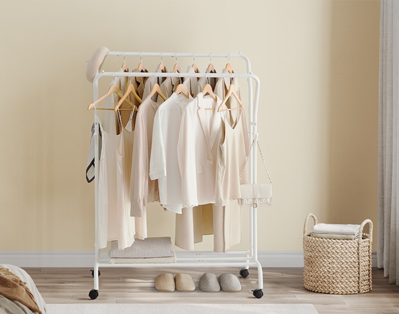 Depozitare versatila - Cu o sina inalta si una joasa pentru agatarea hainelor de diferite lungimi, carlige pe ambele parti pentru genti si palarii si un raft inferior pentru cutii si pantofi, acest suport de haine va pastreaza toate lucrurile esentiale intr-un singur loc.