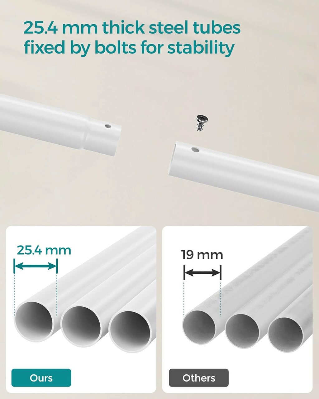 Stabil si rezistent - Cu suruburi care fixeaza tuburile din otel de 25,4 mm grosime, acest suport pentru haine are un cadru stabil care poate sustine pana la 100 kg. Fiecare sina are o capacitate de incarcare statica maxima de 30 kg; fiecare carlig pana la 5 kg; iar raftul inferior poate sustine pana la 20 kg.