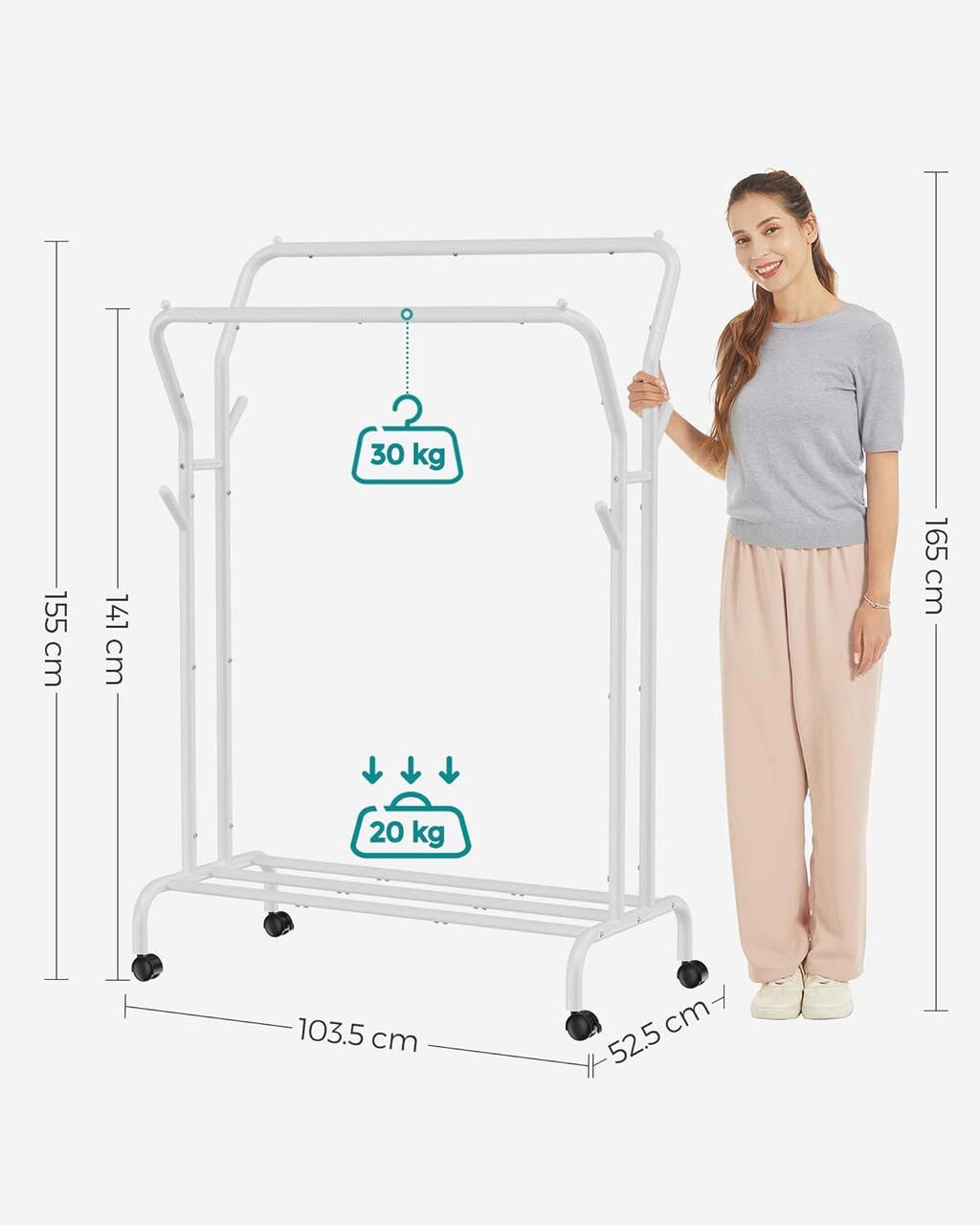 Suport mobil pentru umerase cu doua bare Songmics, 103.5x52.5x155 cm, otel, alb