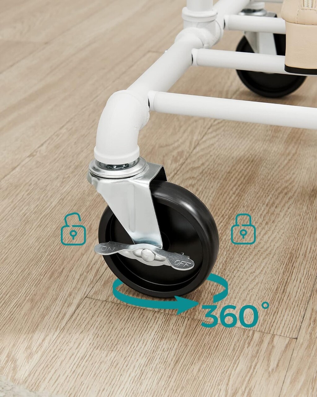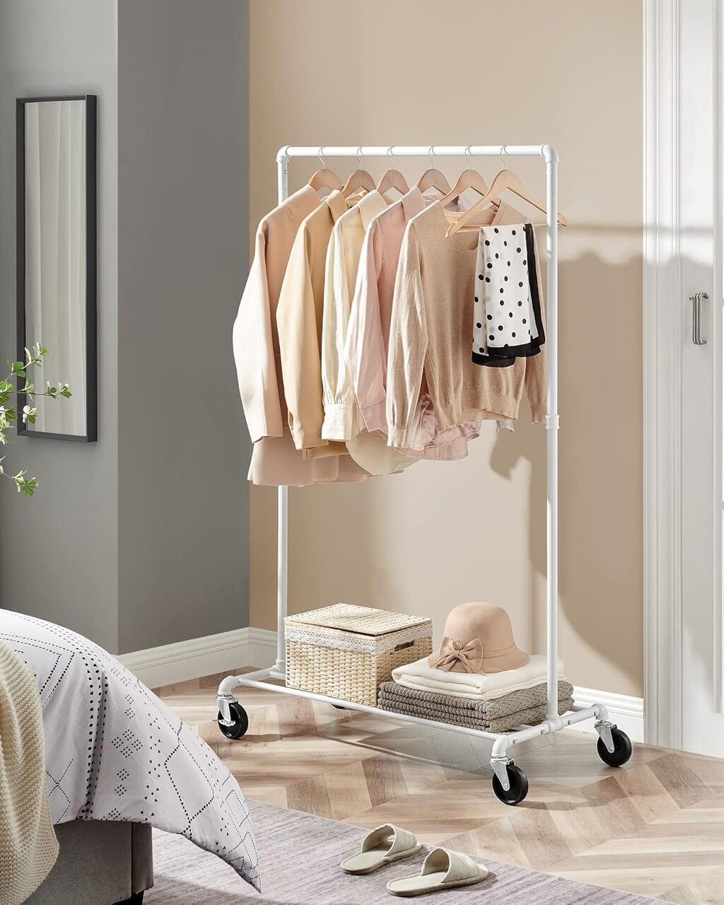 Usor de mutat Cu 4 rotite universale, dintre care 2 pot fi blocate, puteti muta cu usurinta acest suport pentru haine din dormitor pana in dressing si il puteti bloca pe pozitie daca este necesar.